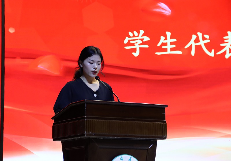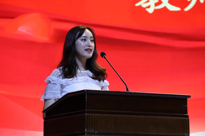 外国语学院教师尹虹霓代表全体教职工上台发言。她表示,我校处在本科办学水平合格和师范专业认证两大评估的关键发展期,对我们的老师也提出了更高要求。因此她给老师们提出三点建议:爱岗敬业,恪尽职守,努力成为学生的良师益友;乐于奉献,以高尚的人格魅力引导学生树立正确的人生观和价值观;转变观念,勇于创新,积极开展教育教学改革与研究,不断推进专业建设。