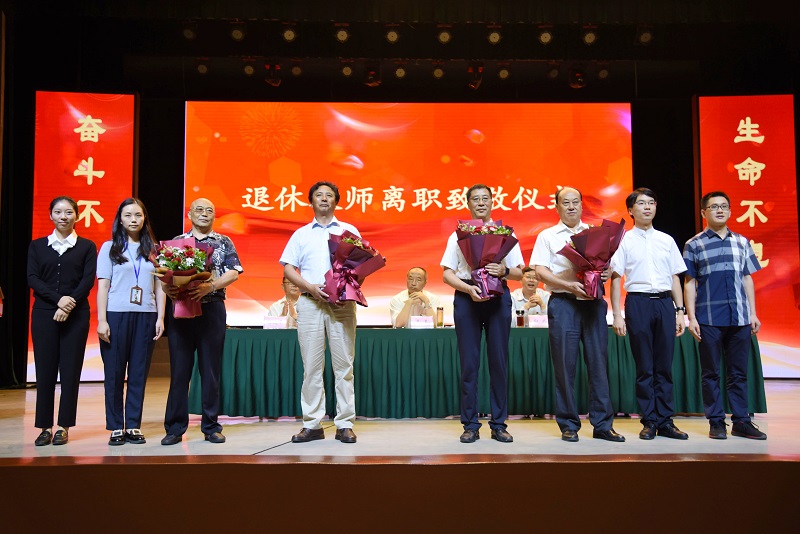 在退休教师离职致敬仪式上,王亚、邹富成、曹茂庭三位优秀青年教师为五位老教师敬献鲜花。新老教师的交替象征着教师使命的传承和交接。