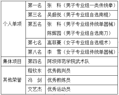 此次比赛中,我校运动健儿秉承“生命不息,奋斗不止”的阿师精神。经过激烈角逐,最终获得个人单项第一1名、第三1名、第五2名、第七1名、第八1名,集体项目第四名的运动成绩。鉴于本次的活动表现,冯剑被授予“优秀教练员”称号,程钦东被授予“优秀裁判员”称号,文艺杰被授予“优秀运动员”称号。