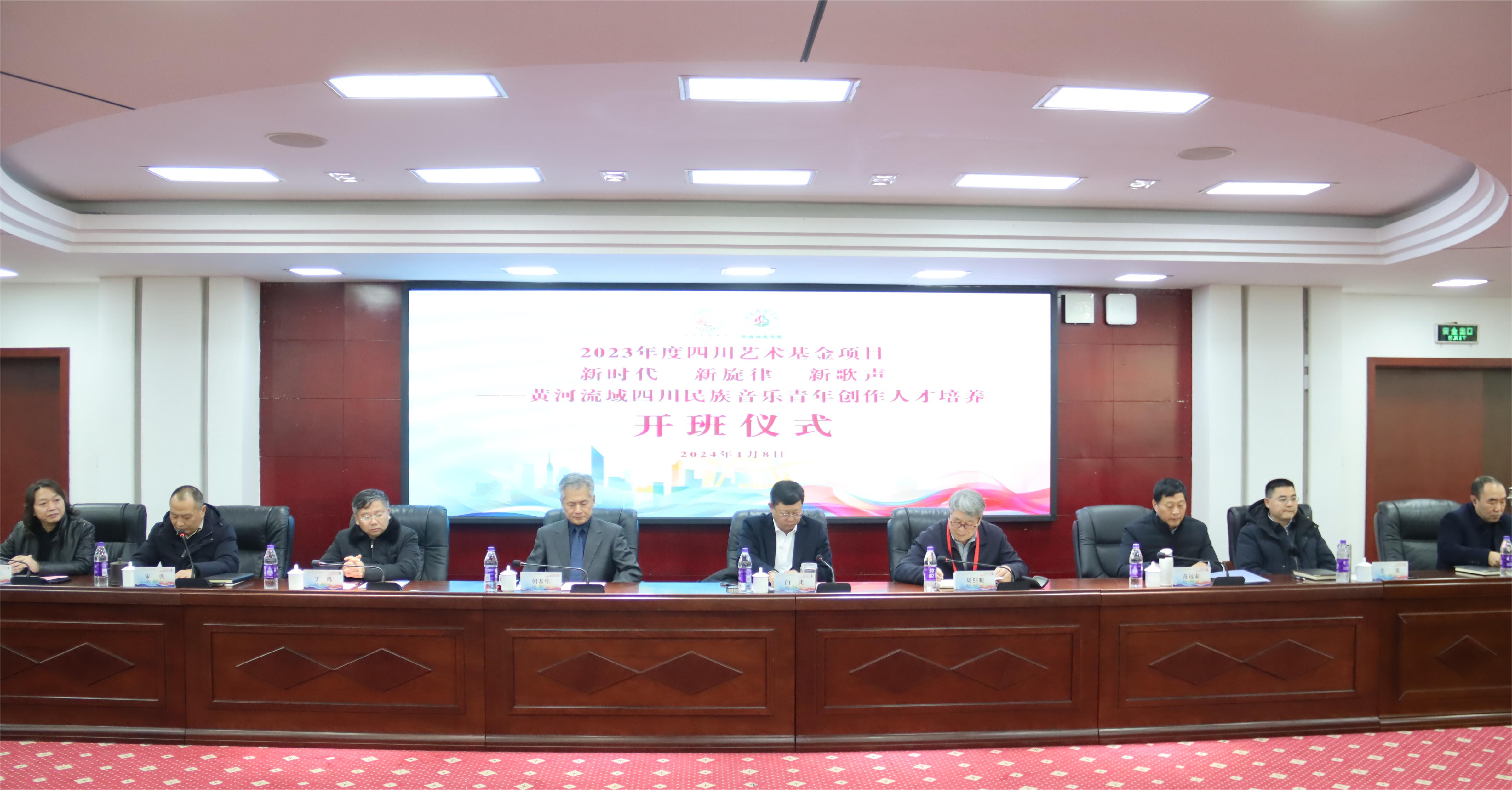 【本网讯】为全面学习贯彻党的二十大精神,落实习近平总书记关于《黄河流域生态保护和高质量发展座谈会》上的系列讲话精神和要求,2024年1月8日,由四川省艺术基金管理中心主办、阿坝师范学院承办的2023年度四川艺术基金《新时代、新旋律、新歌声——黄河流域四川民族音乐青年创作人才培养》项目开班仪式在行政楼二楼会议室举行。中共中央党校(国家行政学院)教授、哲学博士、督学专家组成员、文史教研部原主任周熙明,中国交响音乐季艺术中心常务副主任、秘书长何春生,四川省文联剧协副主席、四川省文旅厅原二级巡视员范远泰,国家一级编剧、四川省文艺评论家协会副主席、四川省剧目工作室(四川艺术基金管理中心)原主任丁鸣;我校党委副书记、校长向武,党委副书记毛英,党委常委、副校长宋弘,党委常委、副校长齐泽民,音乐舞蹈学院院长、项目负责人张刚和来自全省高校、中小学、文化馆、文艺团体的30位学员齐聚一堂,共话四川民族音乐青年创作人才培养。开班仪式由宋弘主持。
