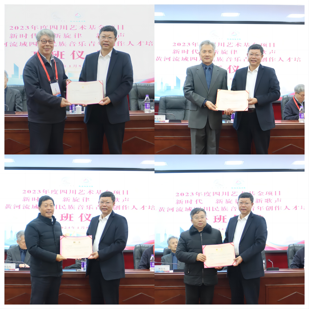 向武在开班仪式上致辞,他代表学校对到场的所有专家学者以及学员表示热烈欢迎。他指出,学校自升本以来紧紧围绕“两评估、两转型”发展战略,统筹事业发展和安全稳定,各项事业取得长足进步,现已从高速度发展阶段迈向高质量发展阶段。在这个转型的关键节点,此次省艺术基金项目的开班启动意义非凡,这既是学校在艺术基金项目上的一次重大突破,也是学校科研实力、学科实力等不断提升巩固的重要体现,更是对学校文化传承和创新工作的充分肯定。希望全体学员充分结合阿坝州特色优势,主动服务国家和四川省文化发展,传承好、发展好黄河流域四川民族音乐文化,把音乐写在民族大地上、写在中国大地上。开班仪式上,向武为授课专家代表周熙明、何春生、范远泰、丁鸣颁发授课专家聘书,并合影留念。