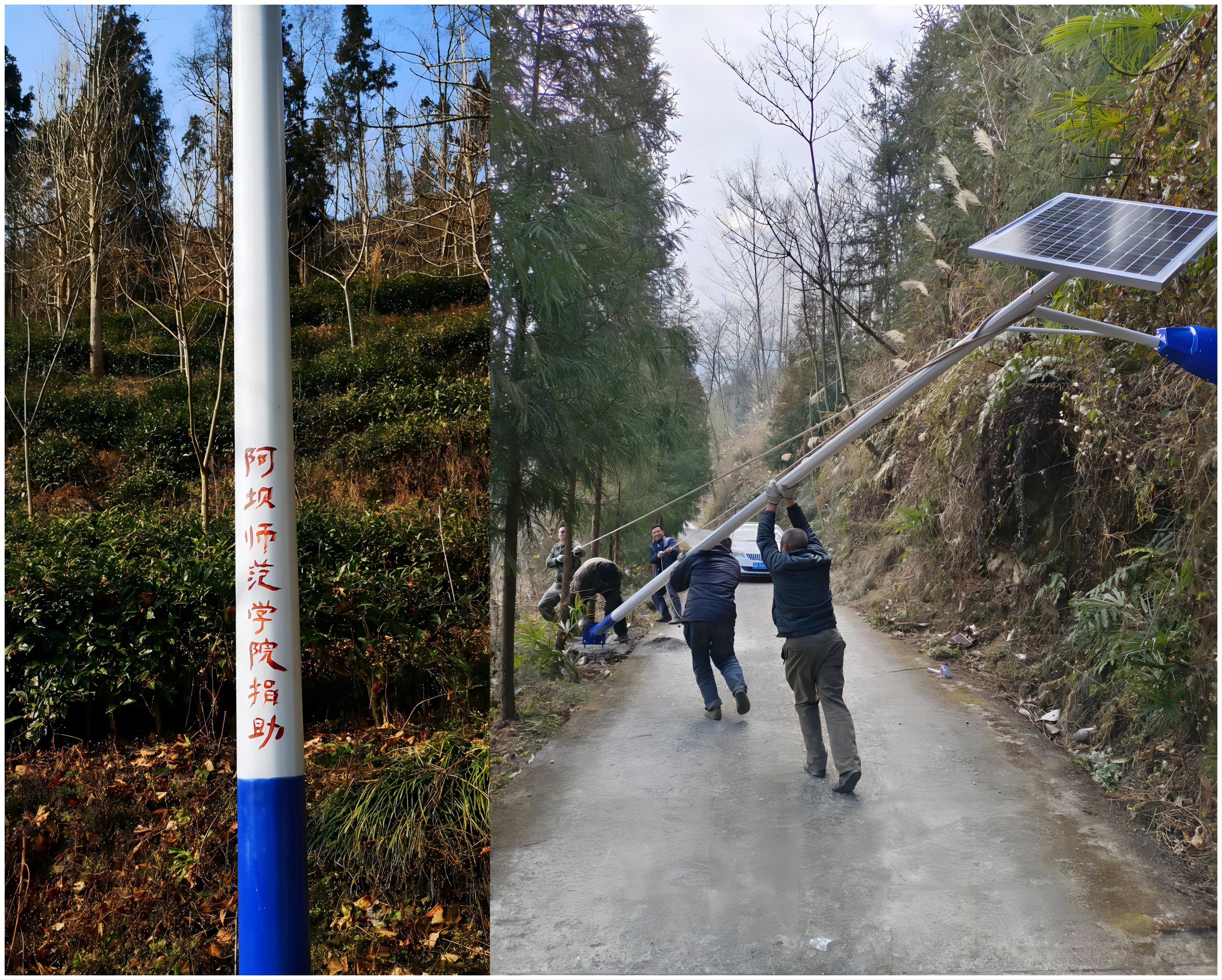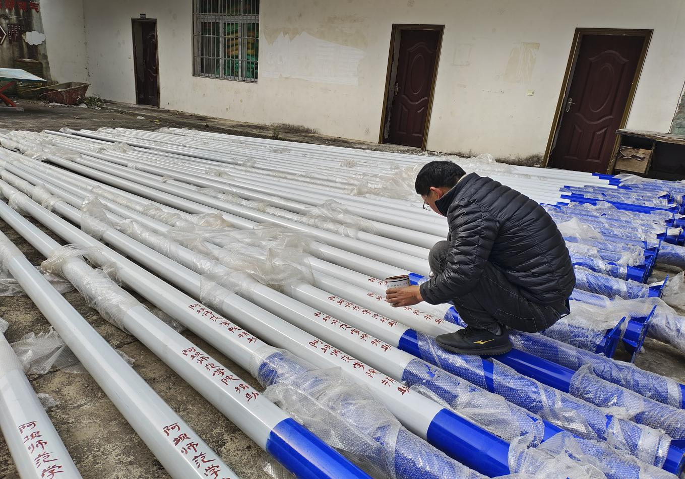 【本网讯】1月9日,我校教师教育学院教师王程受邀为堆叠在水磨镇牛塘沟村老村委会的新购太阳能灯电线杆书写“阿坝师范学院捐助”字样,这80根灯杆即将安装到通村通组弯弯曲曲的道路边、住宅旁,解决多年来村落山高路陡、缺乏交通照明之难。解决道路照明虽算不上耀眼的成绩,却能切实解决村民日常生活中一些急难愁盼,为此我校党委组织部、驻牛塘沟工作队员积极协调,从小切口入手,扎实推进驻村帮扶工作。