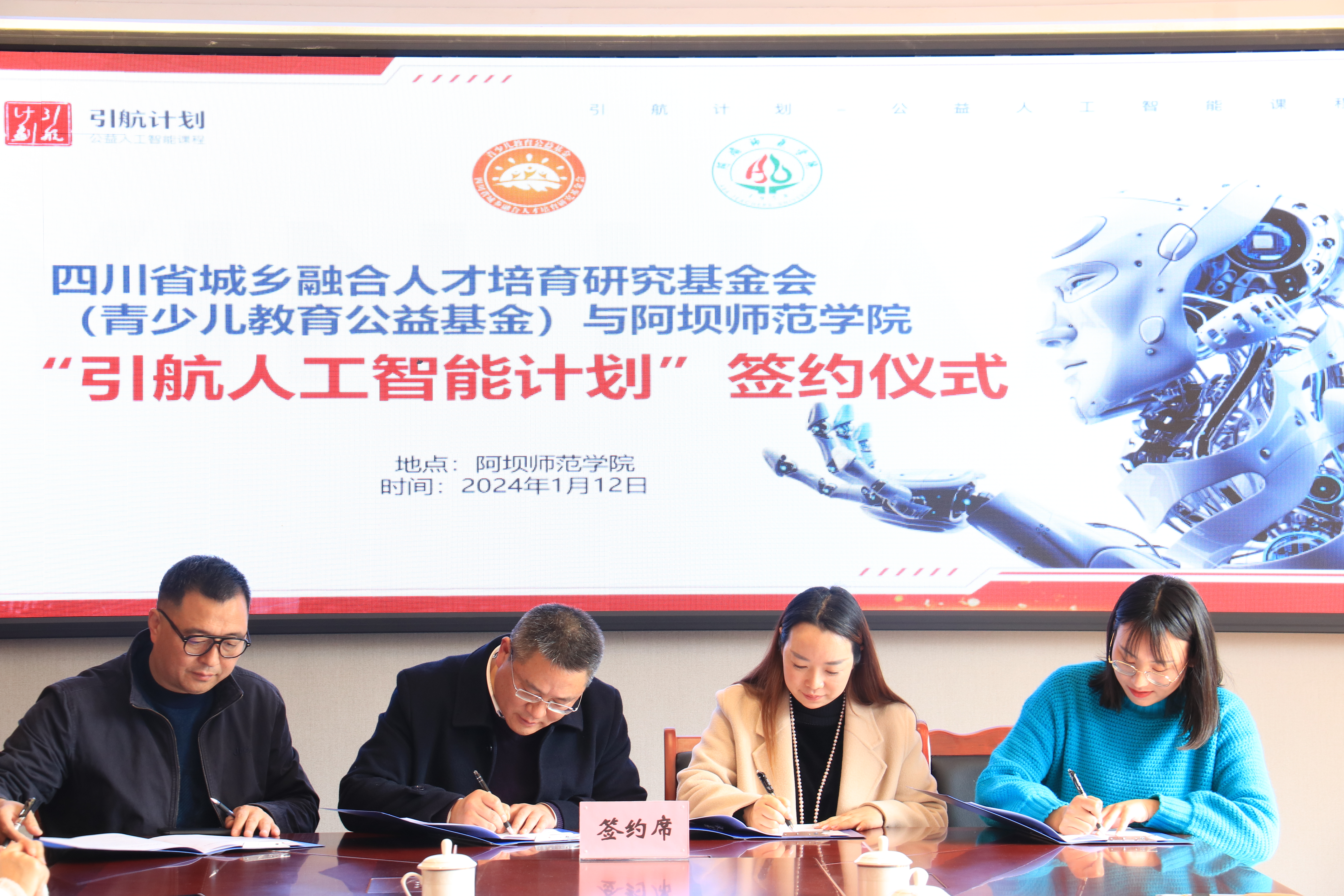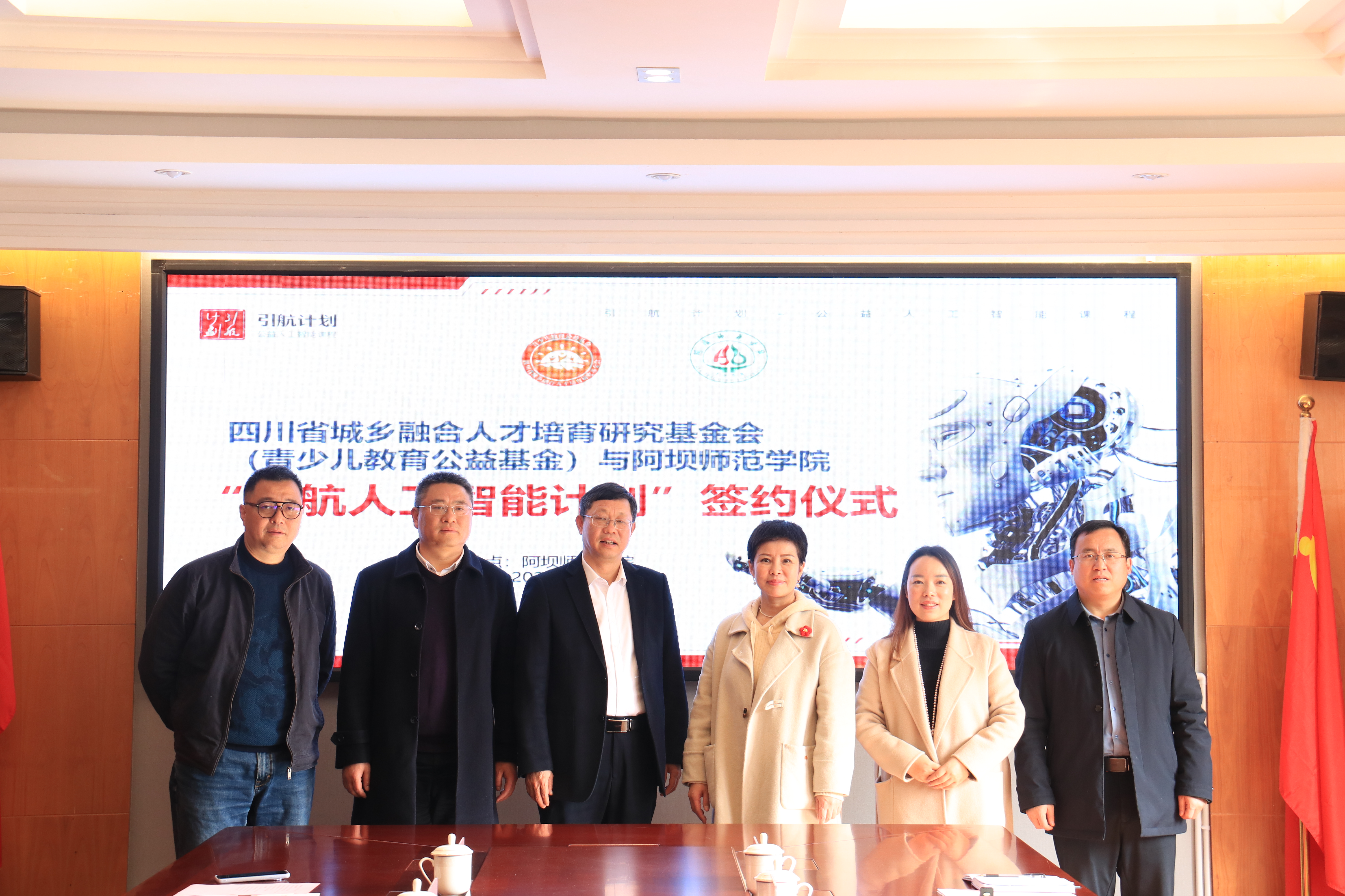 四川省城乡融合人才培育研究基金会、成都市诚学长青公益服务中心、成都智能电客科技有限公司、阿坝师范学院四方共同签订《公益项目合作协议书》并合影留念。