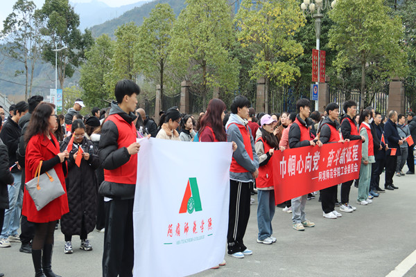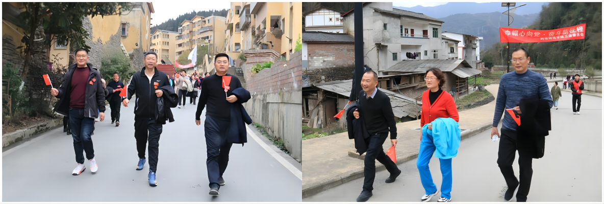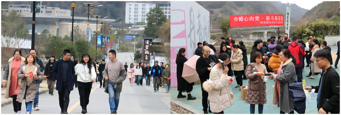 我校全体教职工在体育与健康学院教师牟剋蓉的带领下进行热身运动,点燃了活动现场的氛围。在学生志愿者指引下,全体人员以校大门为起点,途经三水桥、高明桥至长河坝茶壶领取方形小红旗后,经水磨古镇、八一小学到水磨镇政府领取心形小红旗,下山至水磨羌城大门口到达洄澜塔对面停车场领取活动纪念品。行进途中,教职工们拿着小红旗欣赏沿途风景,与朋友畅聊开怀,笑声爽朗,浩荡的队伍宛如一条游动的长龙绕寿溪湖畔而行,形成了一道缤纷亮丽的风景线。