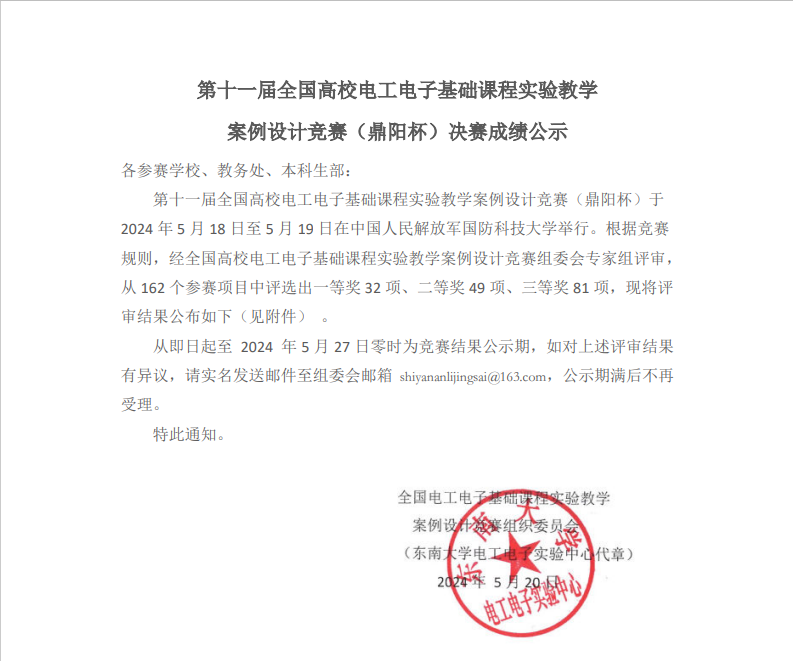 第十一届全国高校电工电子基础课程实验教学案例设计竞赛(鼎阳杯)由中国电子学会、国家级实验教学示范中心联席会主办,该竞赛是全国唯一的高校电工电子类基础课程实验教学赛事,已于2018年被中国高等教育学会纳入全国普通高校教师教学竞赛评估项目,并列入教师教学能力排行榜的数据采集源。