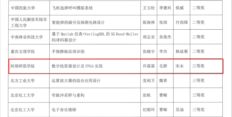 【本网讯】2024年5月18日—19日,第十一届全国高校电工电子基础课程实验教学案例设计竞赛(鼎阳杯)决赛在中国人民解放军国防科技大学举行。经过激烈角逐,我校物理与电子电气工程学院许霖霖、毛群、宋永教师团队“数字抢答器设计及FPGA实现”实验项目,荣获全国三等奖。