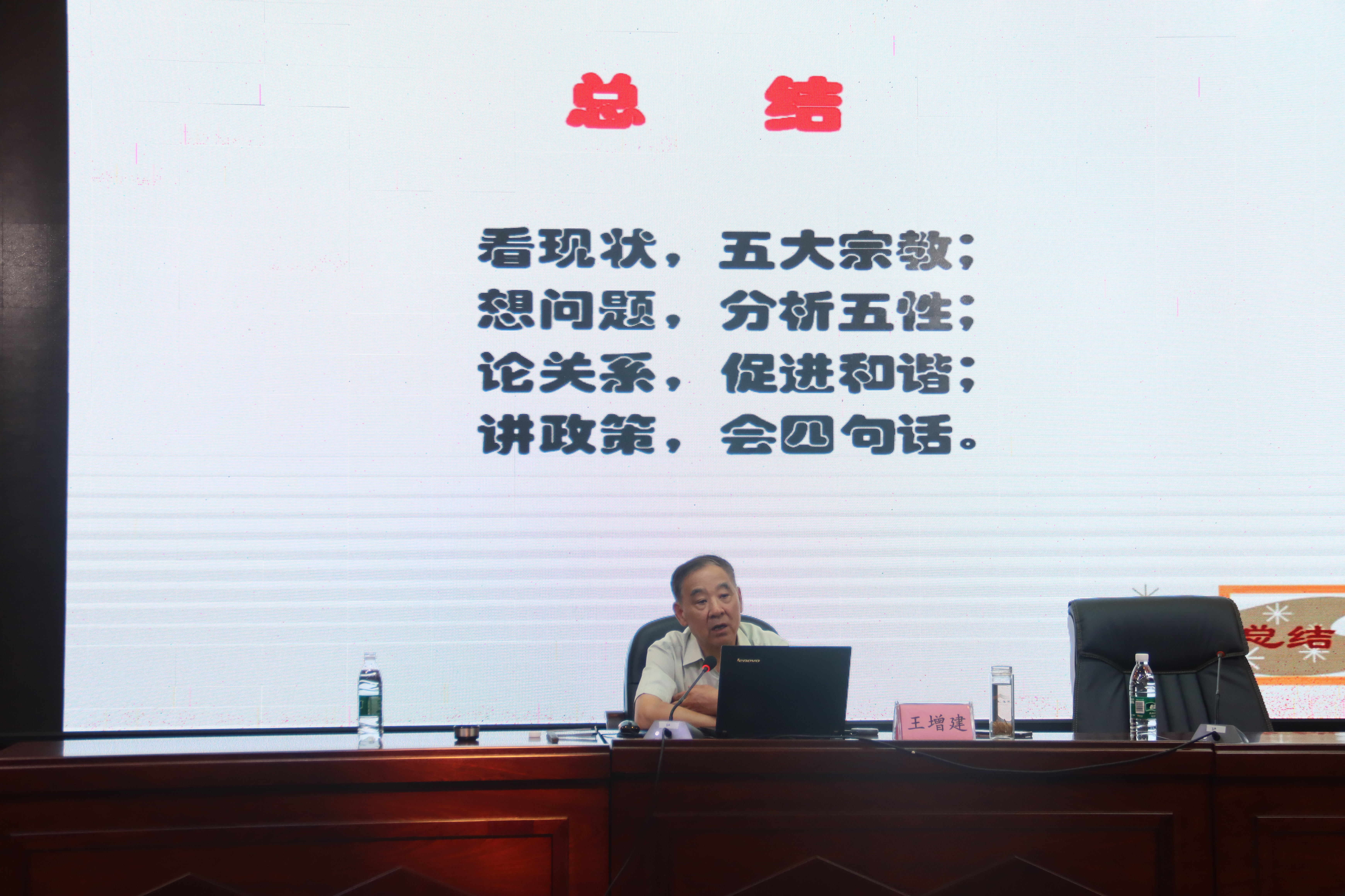 王增建作题为《我国宗教问题和宗教政策》的专题学术讲座。他以问题为导向,从“怎样认识宗教问题”和“怎样处理宗教问题”两个核心问题展开讲述:一是从我国宗教的基本格局、社会属性和当代发展现状介绍我国宗教的基本情况;二是围绕宗教问题的主要表现、基本特征和产生根源三方面详细阐述当前宗教问题和困境;三是围绕宗教关系的立场态度、内容特征以及历史演进,详细阐述新形势下的宗教关系;四是从宗教工作基本方针的形成发展、政策内涵和理论框架进行研讨。他提到:“了解世界,有必要了解宗教。”并向与会人员强调宗教的重要性,全体人民坚持政治上团结合作,信仰上互相尊重,在党的执政过程中促进宗教关系和谐,聚集统一战线人民群众的力量,助力社会主义伟大建设事业。