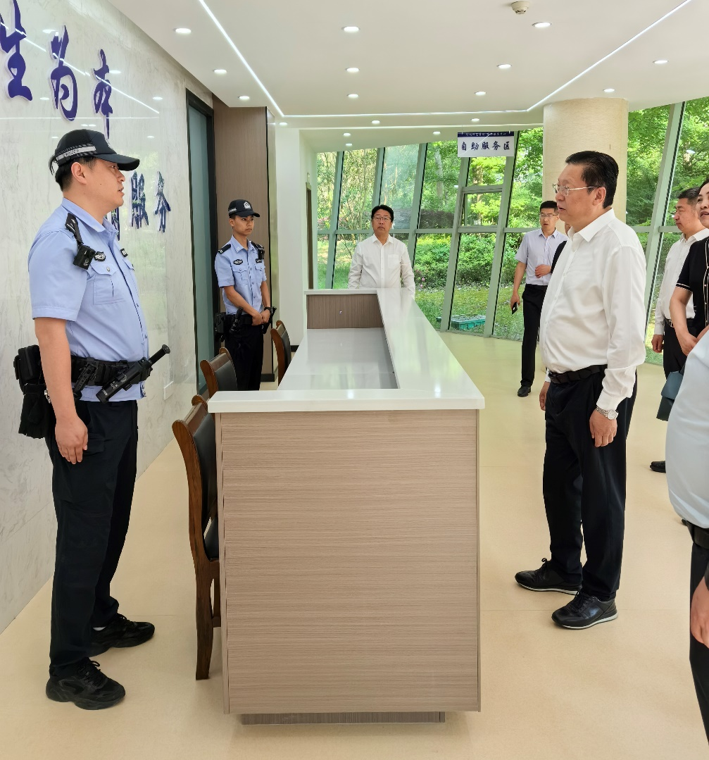 罗振华一行莅临校园警务服务中心,保卫处负责人详细介绍了警务中心1+2+N管理力量配备以及“三网”建设(天网、公安专网、互联网)情况,重点介绍校园一键报警应对、突发情况应急处置、可疑目标入侵以及热成像等功能,并强调通过网格化管理承担“捍卫政治安全、维护治安秩序、开展警务服务”三大职能。