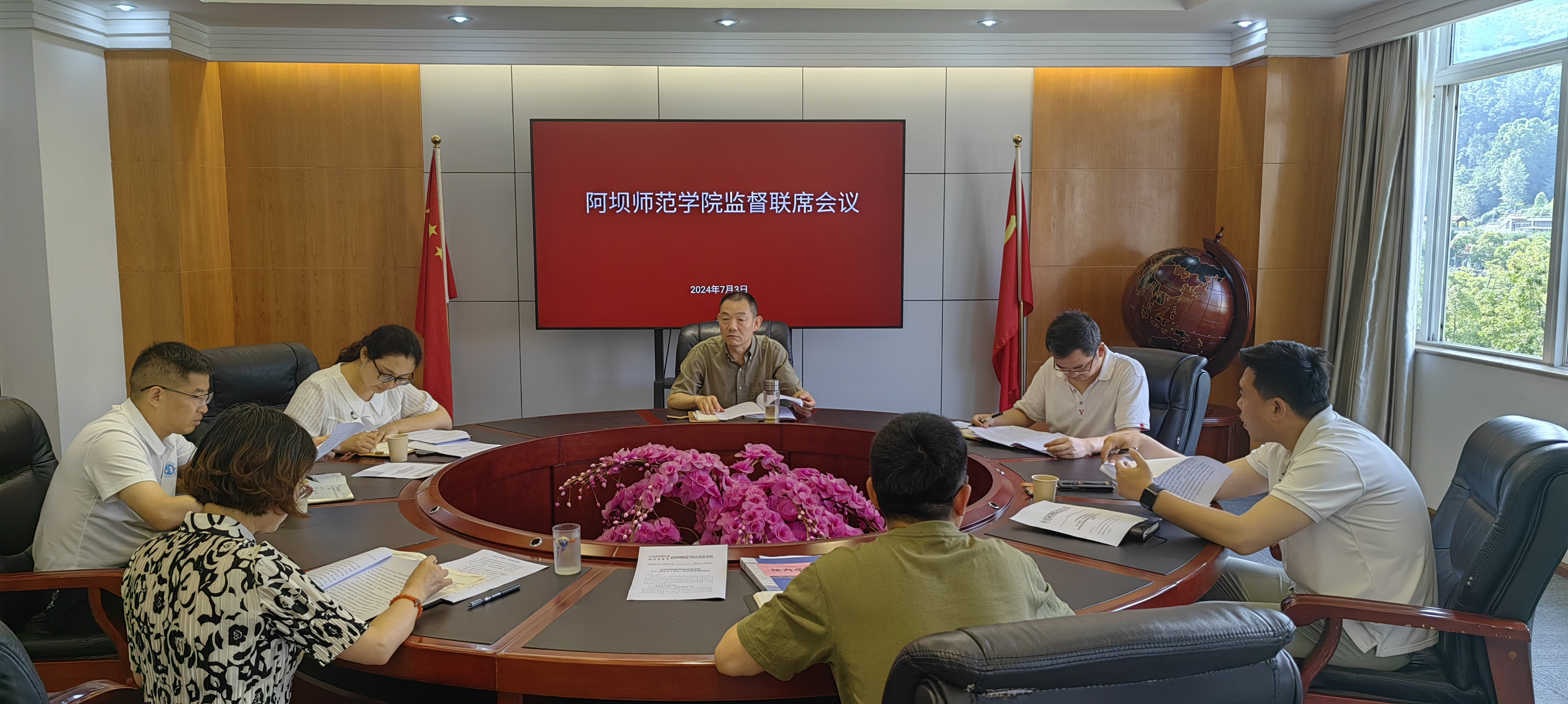 【本网讯】为坚定不移推进全面从严治党向纵深发展,完善权力监督制约机制,健全党委统一领导、全面覆盖、权威高效的监督体系,7月2日,学校组织召开监督联席会议。省纪委监委驻阿坝师范学院纪检监察组组长、党委副书记、纪委书记朱建军主持会议,学校党政办公室、组织部、宣传统战部、纪委办公室、学生工作部、工会等部门主要负责人参会。