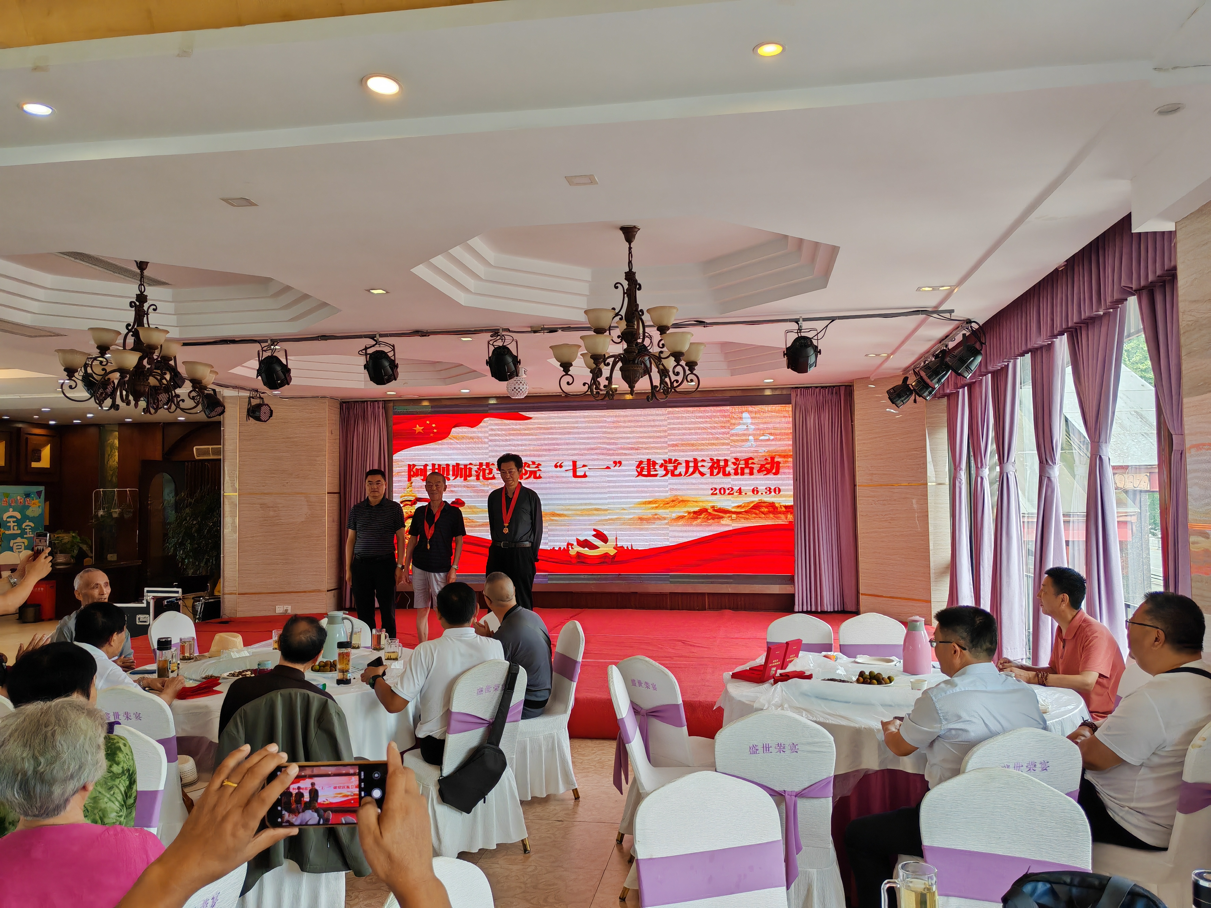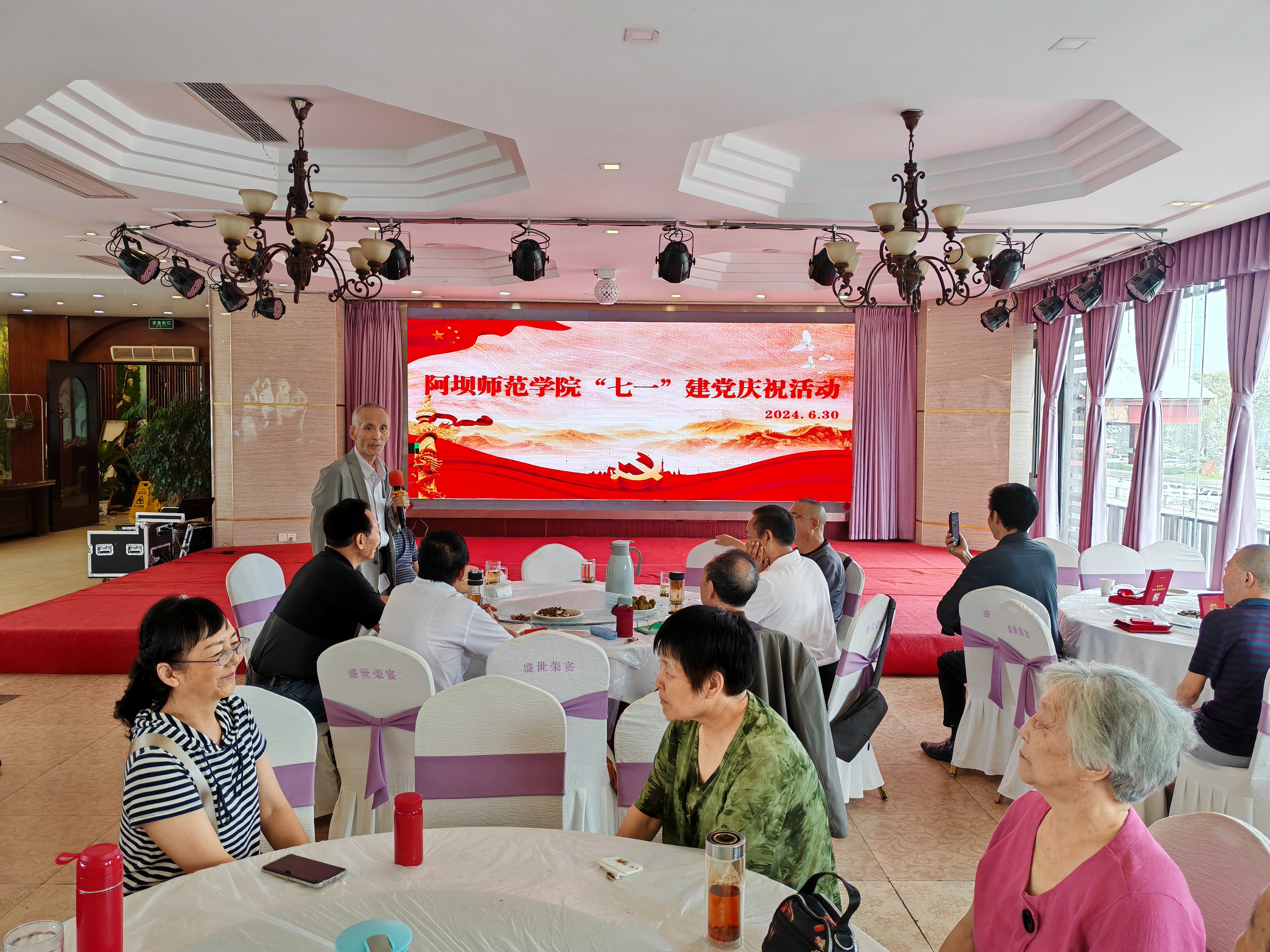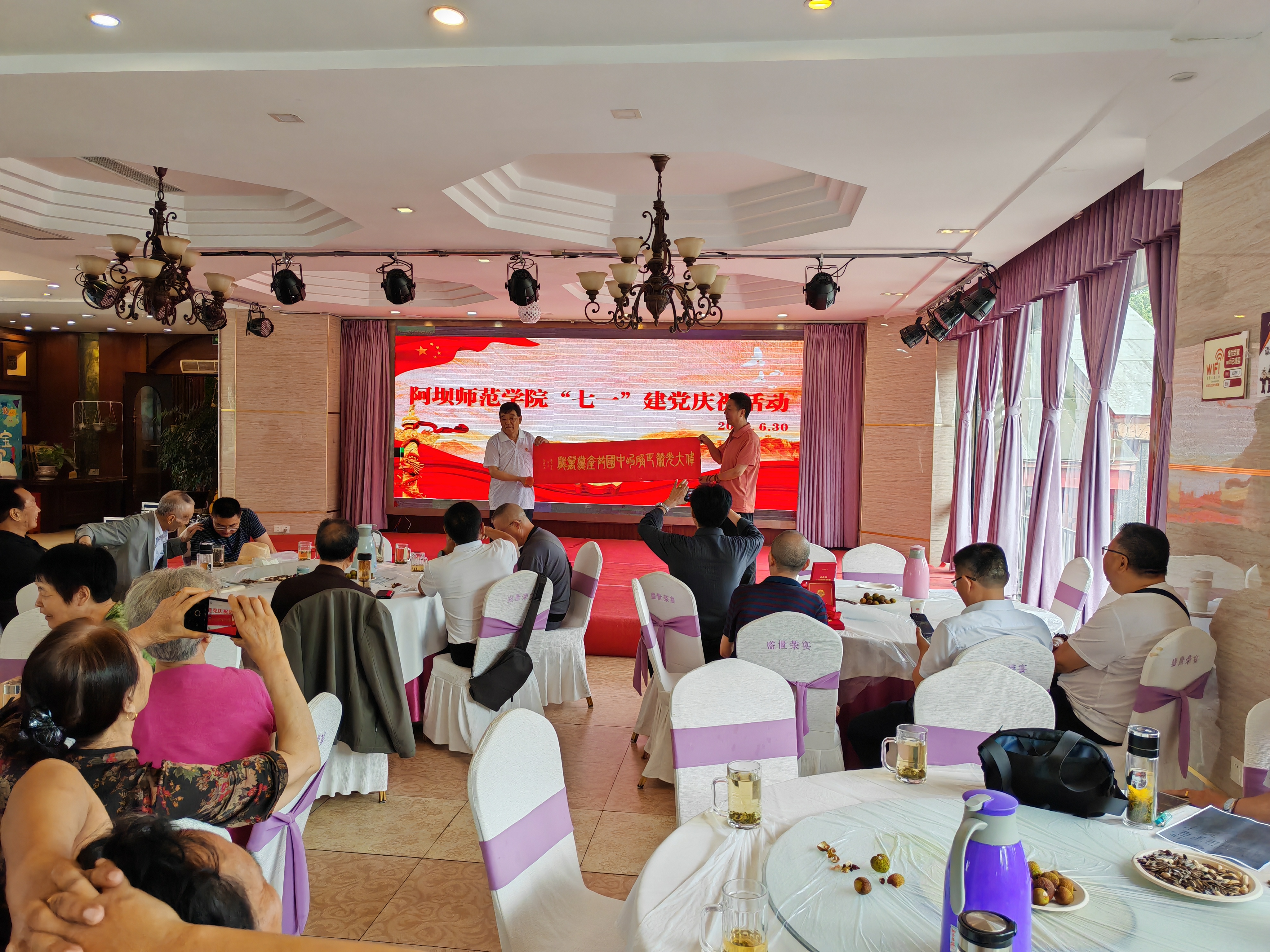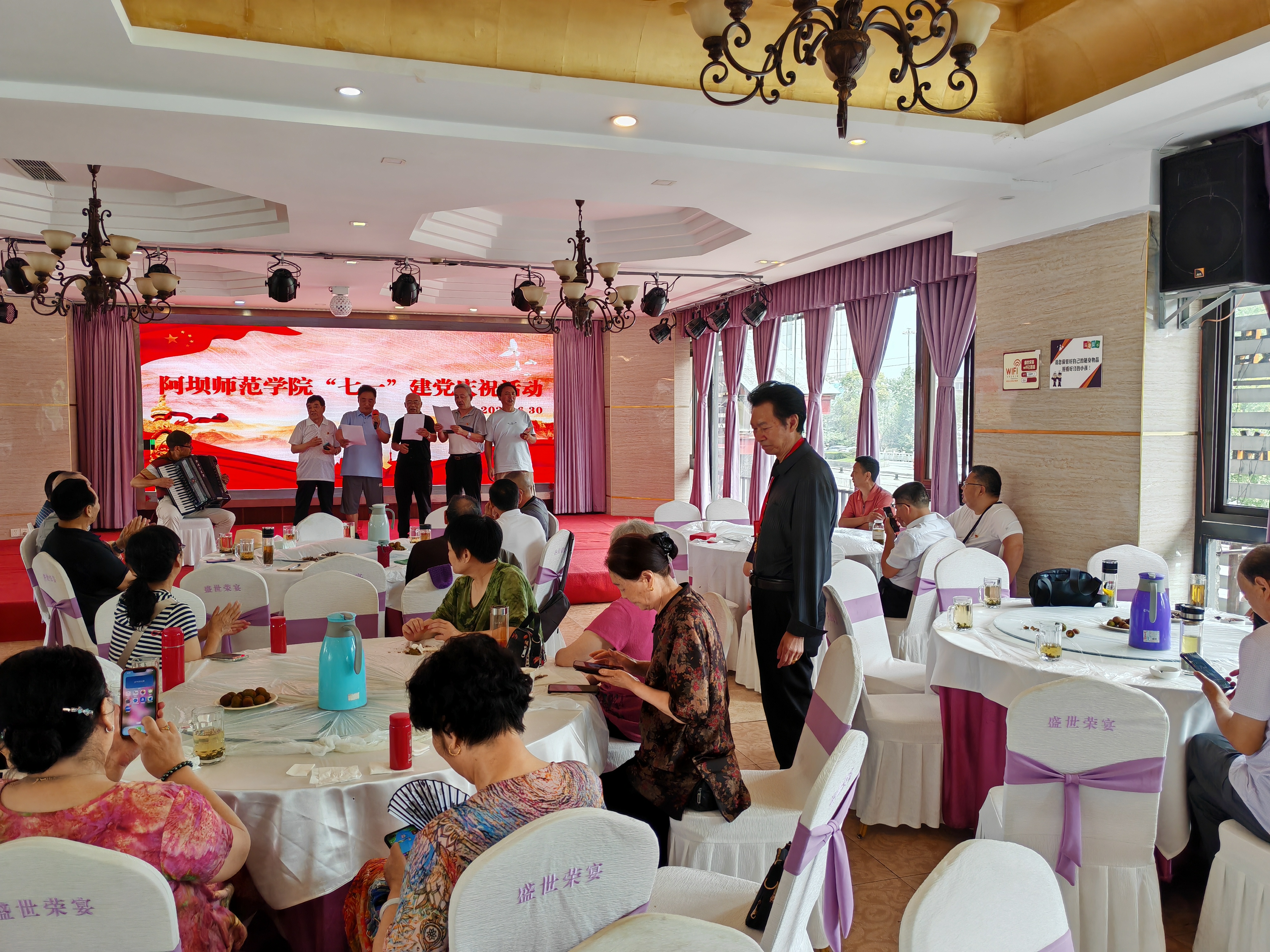 离退休一支部的党员同志们组织了形式多样的节目。杜裕泉同志献唱经典红歌,唱出了与党同行的心声,唱出了对党的热爱和忠诚;史继林同志朗诵文学作品《亲爱的党,我们永远跟着你走》,一言一语承载了对党的歌颂和祝福;离退休第一党支部书记焦国锐同志挥洒笔墨,书写篆体作品《中国共产党万岁》,字字倾注热情为党献礼;赵曦同志拉起了手风琴,琴声欢快响亮、婉转悠扬;阿桑同志演唱少数民族歌剧《尘埃落定》中的经典唱段《情话》,音乐感人,令人回味无穷;最后,党员同志们合唱了歌曲《没有共产党就没有新中国》,同志们激情澎湃、豪情万丈,现场气氛热烈。