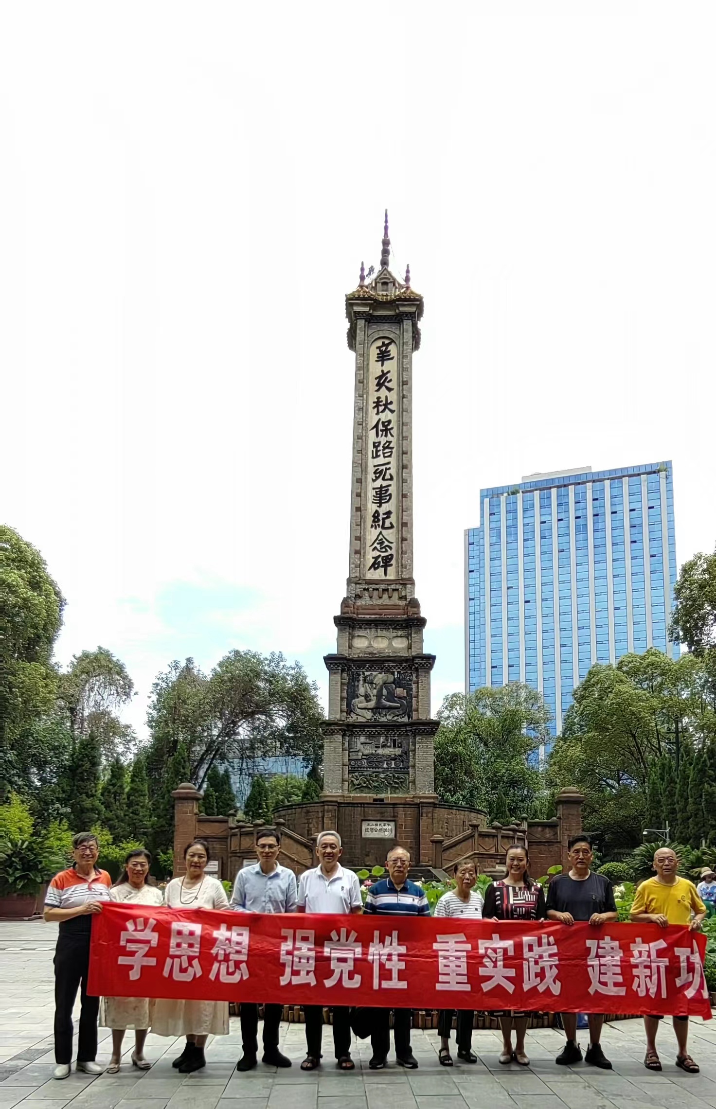 离退休二支部的党员同志们齐聚成都人民公园,在党支部书记赵曦同志的组织下开展了主题党日活动。党员同志们满怀爱党爱国赤子之心,激情昂扬,放声齐唱《没有共产党就没有新中国》,在面对辛亥秋保路死事纪念碑时,心潮澎湃,誓言要赓续光荣传统,传承榜样的力量,积极发挥余热,以实际行动助力学校各项事业再上新台阶。