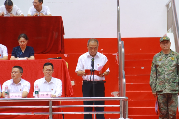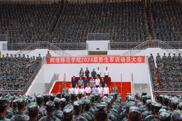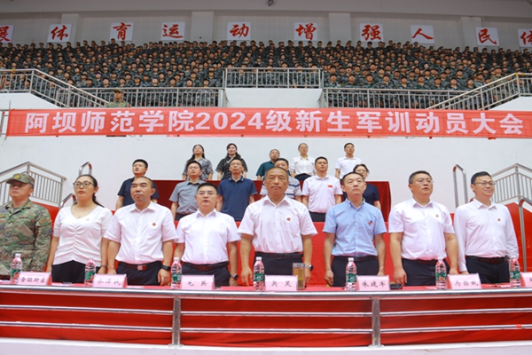【本网讯】我校于9月13日14:00在体育馆隆重举行2024级学生军训动员大会。汶川县人民武装部上校部长、军训团团长吴强,学校党委书记吴昊,省纪委监委驻阿坝师范学院纪检监察组组长、党委副书记、纪委书记朱建军,党委副书记毛英,党委常委、副校长马昌威,党委常委、副校长齐泽民,党委常委、组织部部长刘伟,党委常委、宣传统战部部长查旺斯基出席动员大会。党政办公室、组织部、宣统部、学工部、教务处、团委、保卫处负责人,各二级学院党委书记、院长,2024级新生班级辅导员以及2024级全体学生参加动员大会。本次大会由学生工作部部长钟顺秋主持。
