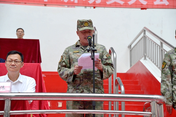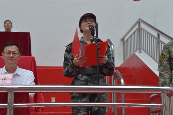 军训教官代表王清霖发言。他表示全体军训教官将秉持军队传统,严于律己做好榜样,严格按照军事训练计划,认真履行职责,科学训练,因材施教,提升参训人员军事素养和国防意识,注重细节,耐心指导,严格训练,让广大参训学员掌握军事知识和技能,确保军训任务的圆满完成。他希望同学们珍惜机会,积极配合,勇于挑战自我,在军训中不断成长和进步。