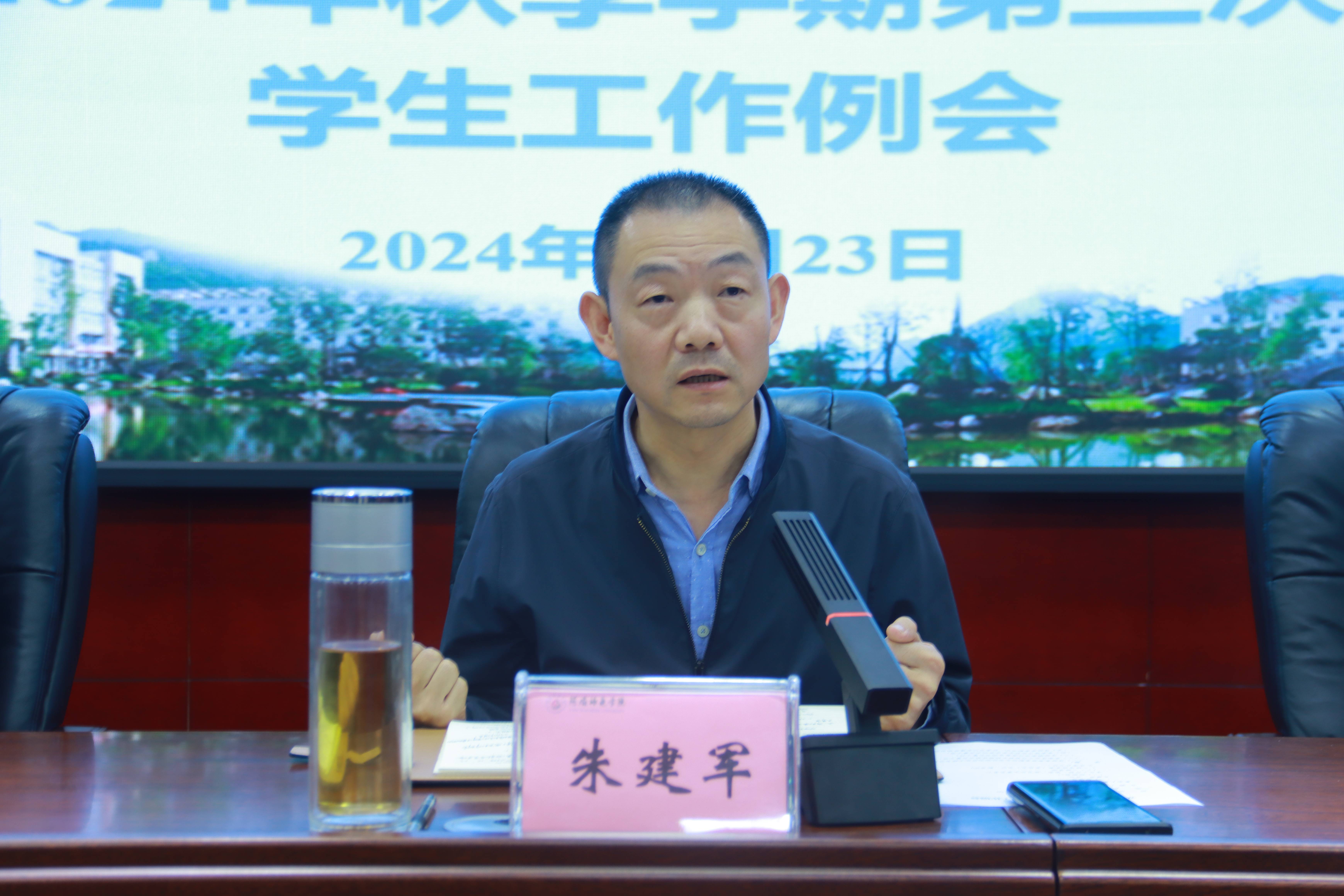 【本网讯】10月23日,学校在行政楼二楼会议室召开2024年秋季学期第三次学生工作例会,安排部署近期学生工作。省纪委监委驻阿坝师范学院纪检监察组组长、党委副书记、纪委书记朱建军,党委常委、副校长、工会主席宋弘出席会议,党委学生工作部、校团委、保卫处主要负责人,各二级学院书记、副书记和学生工作办公室主任参加会议。会议由学生工作部部长钟顺秋主持。