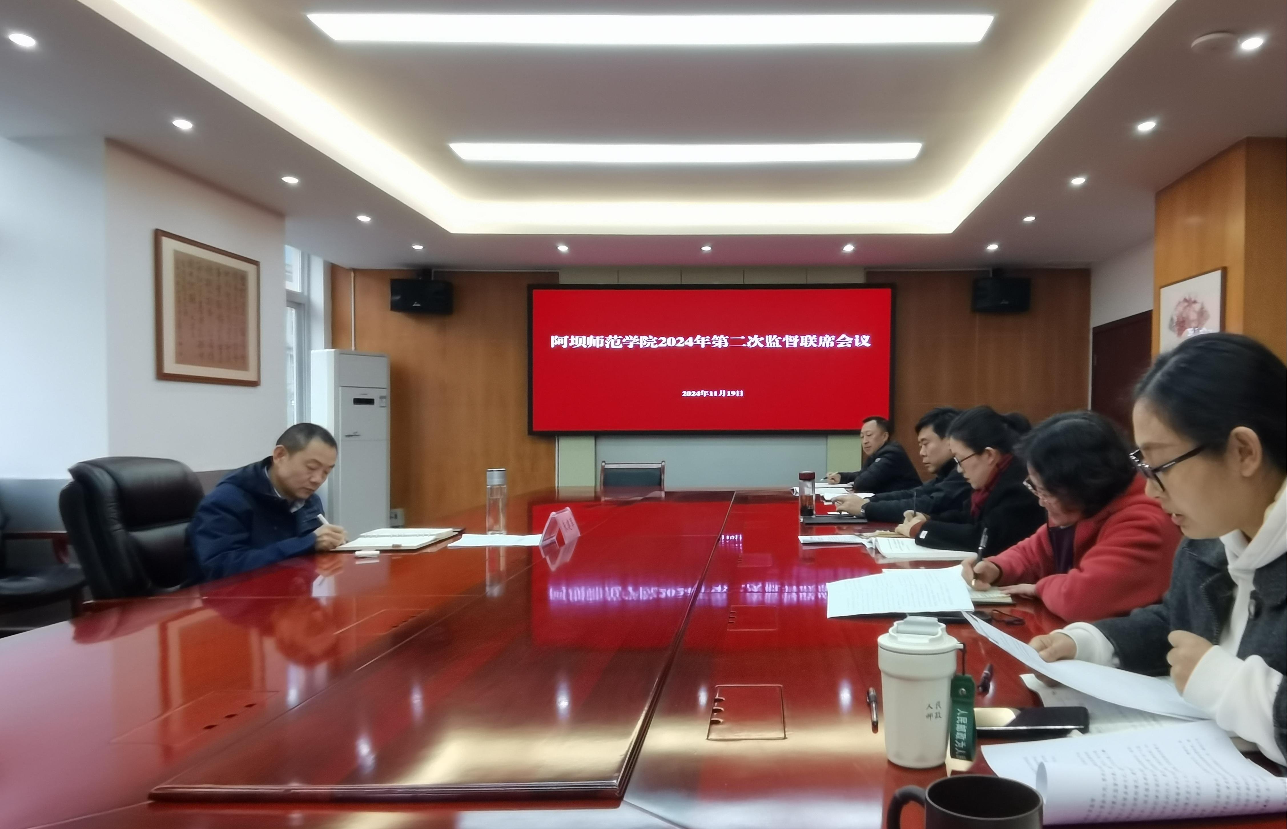 【本网讯】为坚定不移推进全面从严治党向纵深发展,完善权力监督制约机制,健全党委统一领导、全面覆盖、权威高效的监督体系,以党内监督为主导,促进各类监督贯通协调。2024年11月19日,阿坝师范学院召开2024年第二次监督联席会议。省纪委监委驻阿坝师范学院纪检监察组组长、党委副书记、纪委书记朱建军同志主持会议,监督联席会议成员单位主要负责同志参加会议。