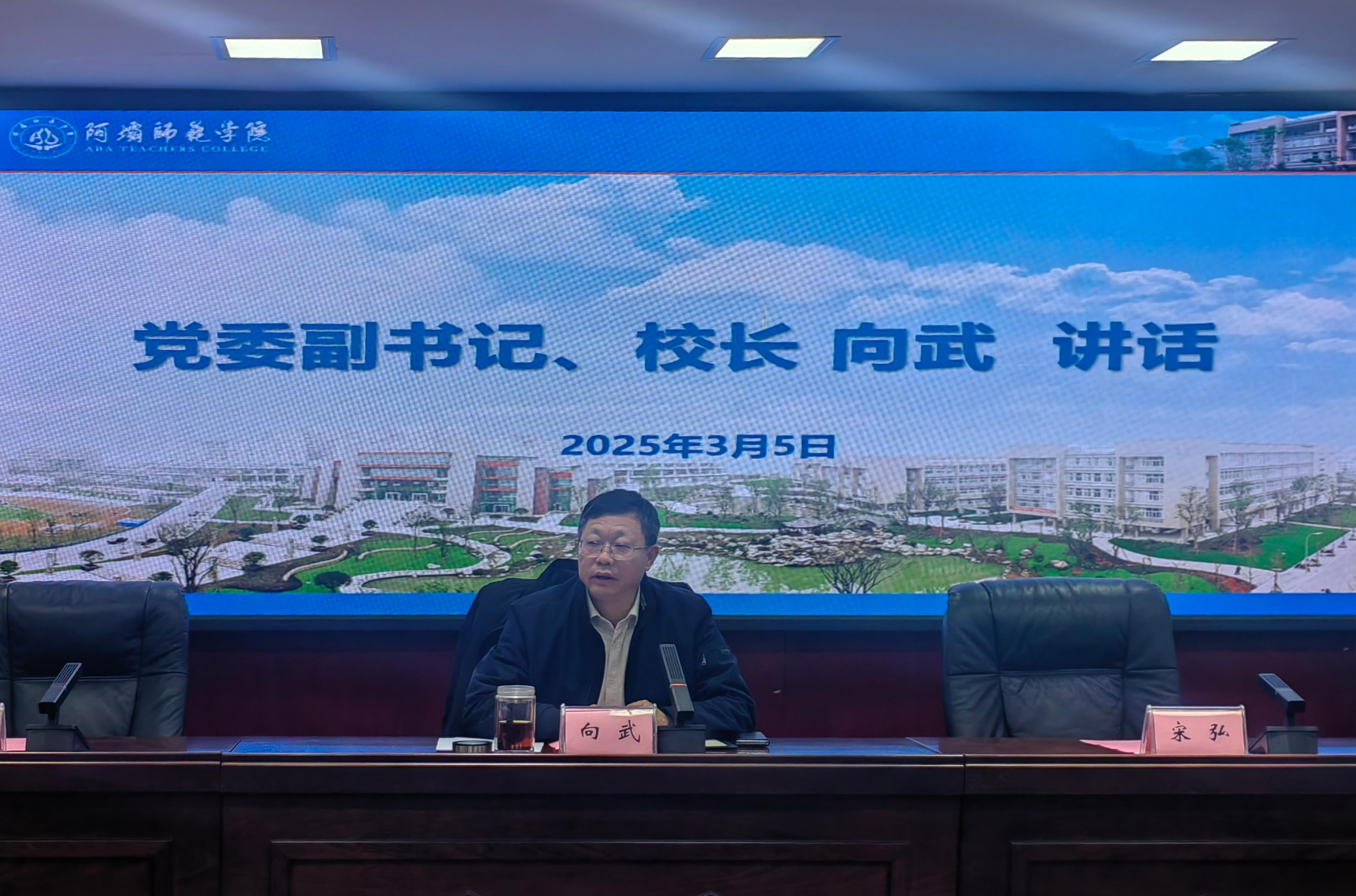 【本网讯】为深入学习贯彻习近平总书记关于安全生产的重要指示批示精神和总体国家安全观,全面落实省委、省政府和教育厅安全稳定工作的决策部署,全力维护学校安全稳定。3月5日下午4时30分,我校在行政楼二楼会议室举行了2025年安全稳定工作会议,学校党委副书记、校长向武,党委常委、副校长、工会主席宋弘,党委常委、副校长齐泽民,党委常委、副校长刘伟出席会议,各职能部门主要负责人、二级学院党政主要负责人参加会议。会议由刘伟主持。