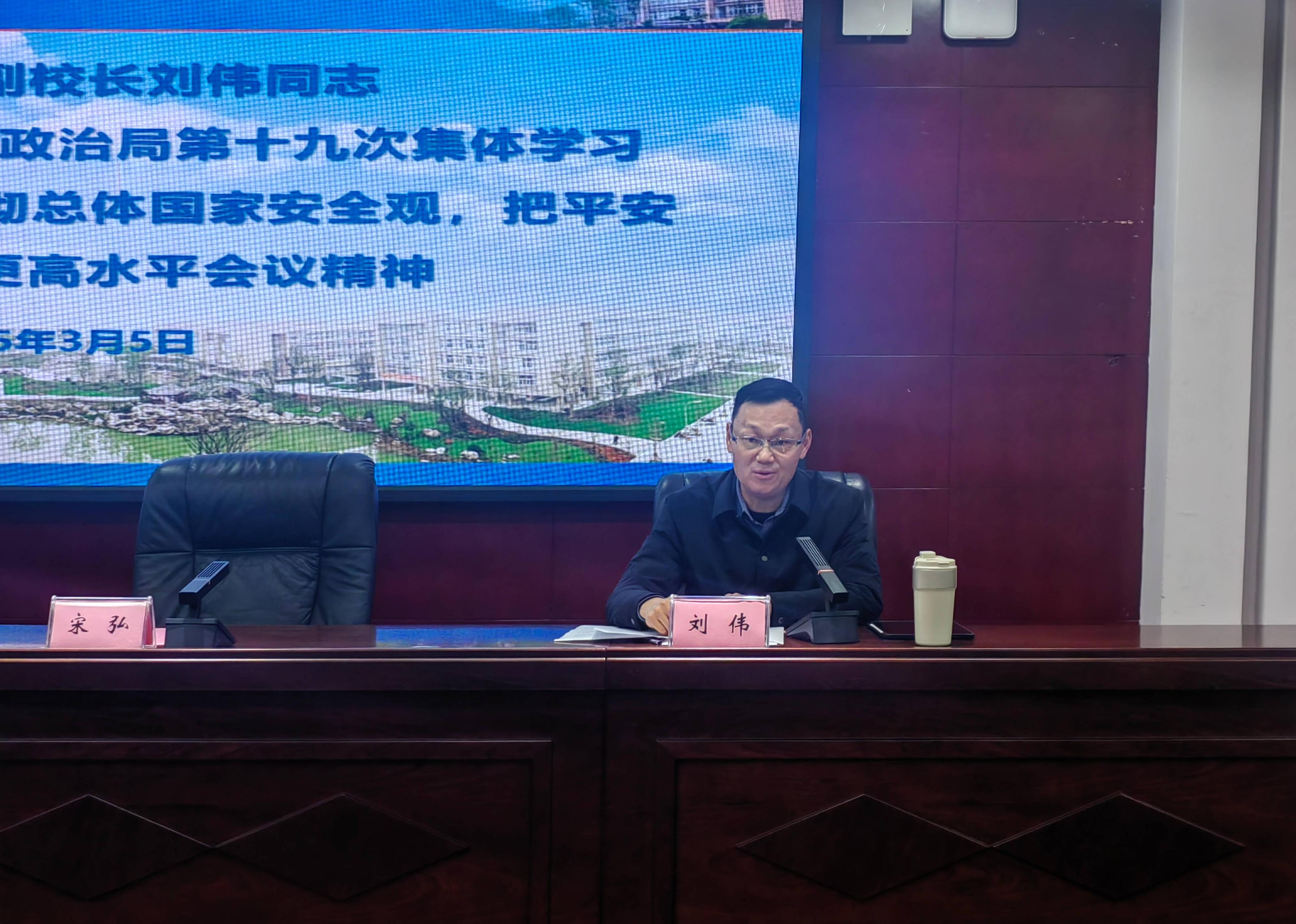 刘伟领学了习近平总书记在中共中央政治局第十九次集体学习上的讲话精神,并传达了四川省教育系统安全稳定工作会议精神。他强调,围绕学校安全的核心任务,必须守牢学生身心健康、校园食品安全、校园消防安全、校园交通安全、校园建筑安全、校园周边安全、学校防灾减灾阵地;必须压实工作责任,确保职责履行到位,将任务细化至最小单元、落实至每个岗位;必须完善工作机制,提升工作质效,有效预防和处理安全风险;必须强化协同联动,凝聚工作合力,推进警务服务中心实体化运行。