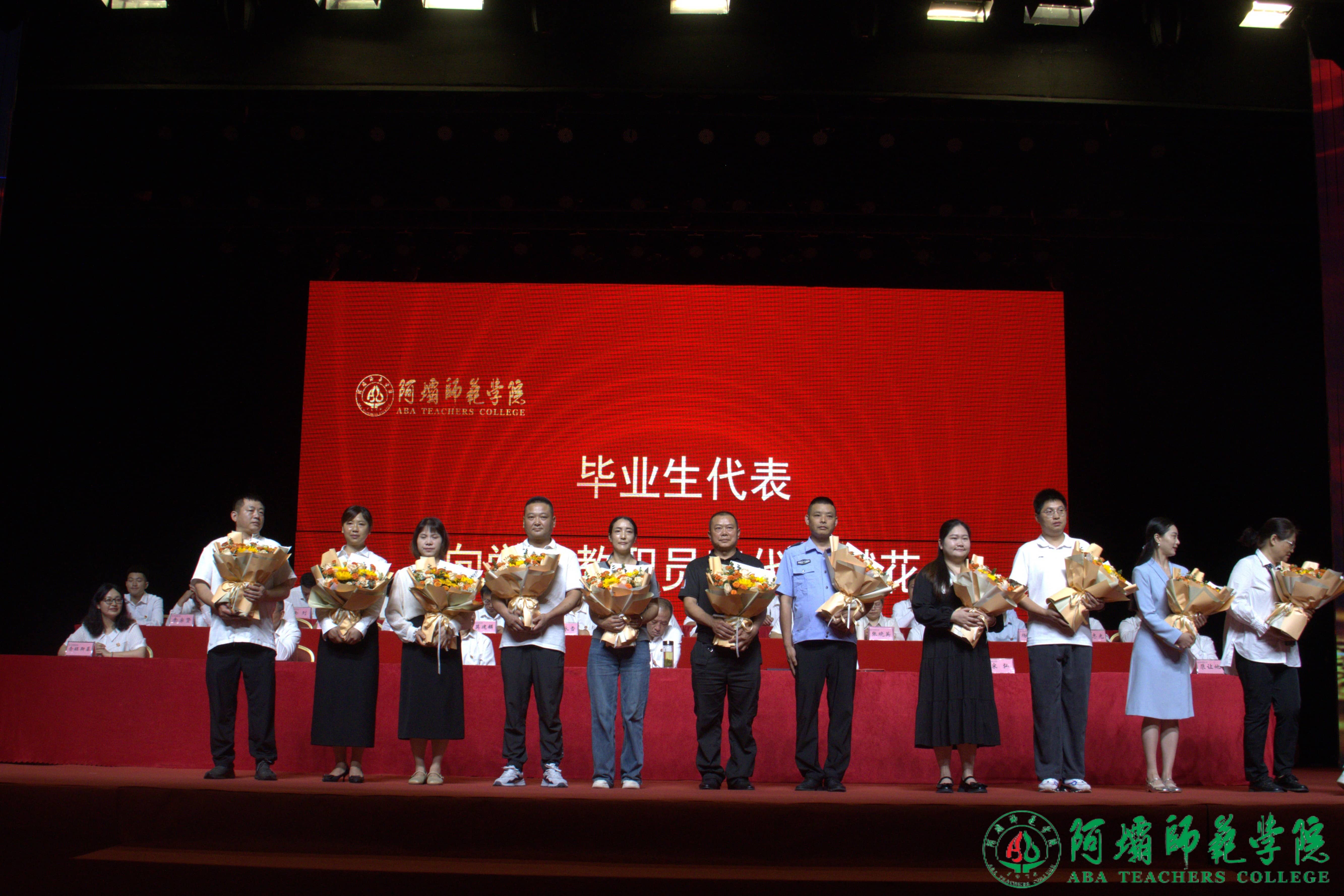 典礼上,毕业生代表还向辛勤付出的教职员工代表敬献鲜花,表达诚挚的感恩之情。典礼尾声,一曲深情的《再见》表达了毕业学子对母校的无限眷恋,铿锵恢宏的《岷江之魂》在会场回荡,凝聚起了大家继续前行的磅礴力量。伴随着祝福的歌声,2025届阿师学子怀揣着山河的壮志,启程新的征程,投身于强国建设的宏伟事业。典礼圆满结束后,学校还在西苑食堂为毕业生们举办了“青春的盛宴:毕业宴会”,让他们在品尝美食和聆听音乐中重温校园时光,感受母校温情。