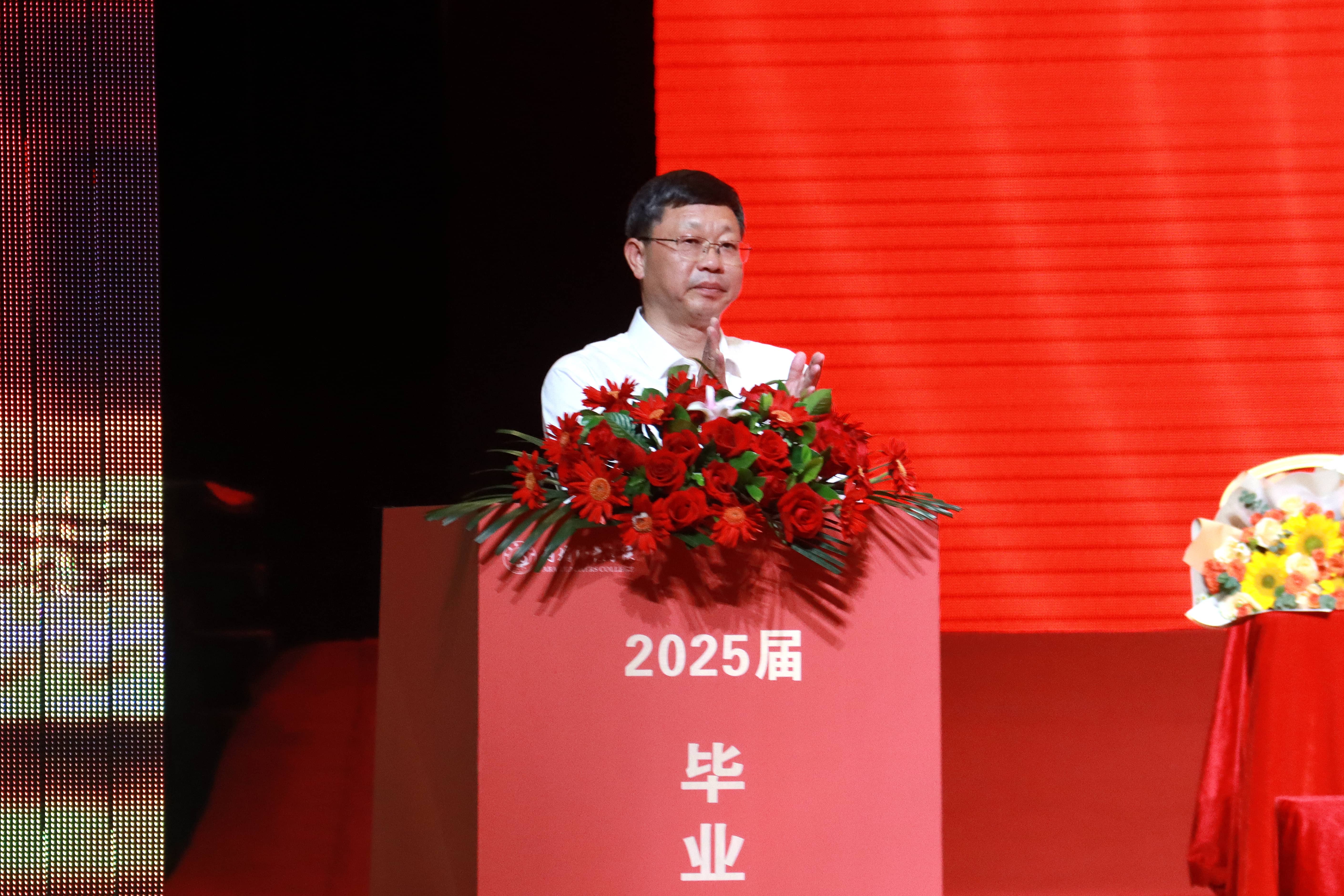 向武校长回顾了2025届毕业生取得的优异成绩,并代表学校向辛勤耕耘的全体教职员工和关心支持学生成长的家长们致以崇高的敬意。他向即将毕业的学子们提出了殷切期望:希望同学们勇做AI浪潮的“冲浪者”,善用智能工具提升效率、洞察先机,成为驾驭技术航向星辰大海的领航人;希望同学们成为跨界融合的“破界者”,积极融合AI思维与多领域知识,在交叉融合地带点燃创新火花,在未知领域开辟新道路;希望同学们坚守人文精神的“守夜人”,始终以人性光辉校准技术发展,永葆伦理底线与人文温度。他勉励全体毕业生要驭势而行,“以AI为翼,翱翔科技蓝海;以人文为魂,深植中华沃土”;以“生命不息,奋斗不止”的阿师精神为炬,在民族复兴的江流中奋楫争先!