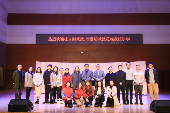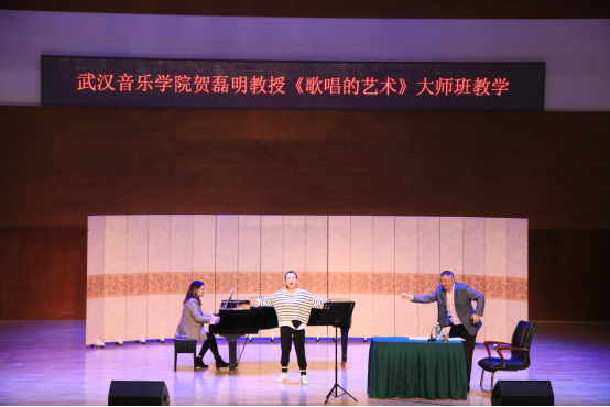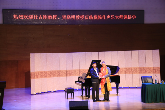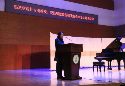 【本网讯】第十二届中国音乐金钟奖声乐大赛刚在成都落下帷幕,在我校音乐舞蹈学院的诚挚邀请下,10月26日下午2:00,金钟奖声乐评委天津音乐学院杜吉刚教授和武汉音乐学院贺磊明教授莅临我校讲学,为我校音乐舞蹈学院全体师生作了题为《歌唱的艺术》声乐教学大师课,学校党委副书记、校长向武和党委副书记、工会主席孙建平参加报告会,讲堂由音乐舞蹈学院副院长张刚教授主持。
