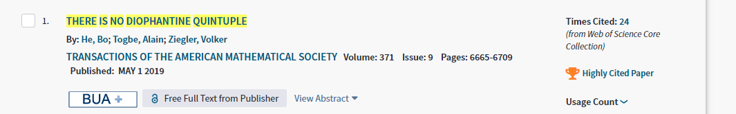 【本网讯】根据2020年7月ESI公布的数据显示,我校数学学院教师何波在2019年5月发表在国际著名数学刊物Trans. Amer. Math. Soc.杂志(中科院JCR二区Top杂志)上的论文“There is no Diophantine quintuple”成功入选“数学”学科全球ESI高被引论文。该论文由何波副研究员与美国Purdue大学A. Togbe教授和奥地利Salzburg大学V.Ziegler教授合作完成。目前,Web of Science数据库显示该文献已经被引用24次。这是我校首篇入选ESI全球前1%高被引论文,也是我校数学学科建设中取得的重要科学研究成果。