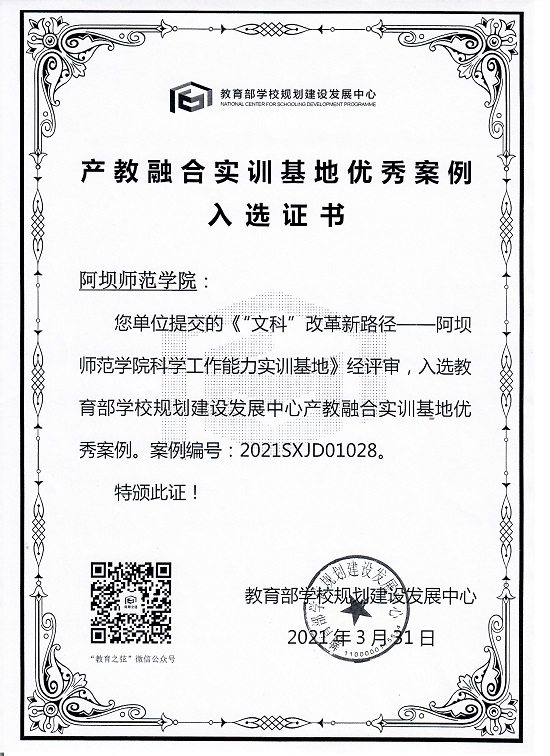 【本网讯】经教育部规建中心组织专家评审,我校提交的《“文科”改革新路径——阿坝师范学院科学工作能力实训基地》入选教育部产教融合实训基地优秀案例。