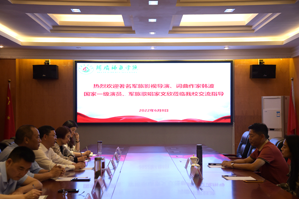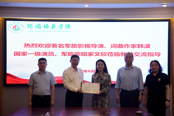 【本网讯】2022年6月8日15:30,著名军旅影视导演、词曲作家韩波及国家一级演员、军旅歌唱家文欣莅临阿坝师范学院交流指导。学校在行政楼406会议室举行聘请文欣任我校音乐与舞蹈学院客座教授的签约仪式。学校党委书记吴昊,党委副书记、校长向武,党委常委、副校长毛英,音乐与舞蹈学院党委书记孙荣、院长张刚、副院长付莉出席签约仪式。
