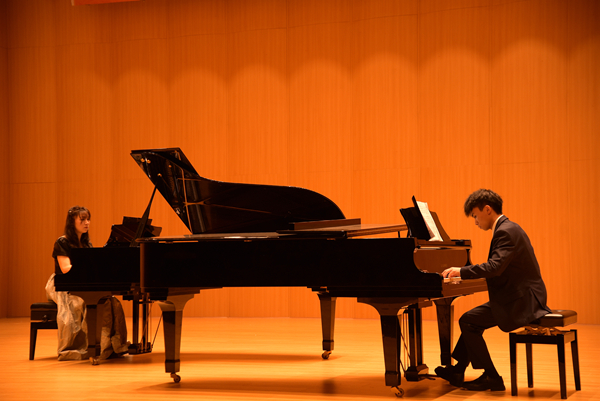 第一场音乐会由四川轻化工大学音乐学院院长、硕士生导师石敦岗教授指导,四川轻化工大学音乐学院硕士研究生宋佳雪、王磊、肖芷萌、陈杨演奏。我校党委常委、副校长宋弘,音乐舞蹈学院院长张刚,副院长付莉,音乐舞蹈专业老师以及四川轻化工大学相关专业教师观看本次音乐会。音乐会共选取了九首中外经典作品。在悠扬的钢琴曲下,海外赤子思恋祖国母亲那真挚深沉的思乡之情在《思恋》中展现的淋漓尽致。随即而来的《“告别”奏鸣曲》再现了贝多芬的孤独与悲痛,有身临其境般的体验,《音诗》跳动的音符,奏出了梦想的光芒,充满着阳光和对未来的憧憬……《f小调第一钢琴奏鸣曲》《松花江上》《C大调幻想曲》《胜利》《b小调第二叙事曲》接连演奏,整个音乐厅气氛愈加热烈,台下掌声连绵不绝。本场音乐会最后一首曲目,双钢琴《再见,诺尼诺》是皮亚佐拉于1959年为其父所作,现改编的双钢琴演奏广为流传。钢琴声落,第一场音乐会圆满结束。