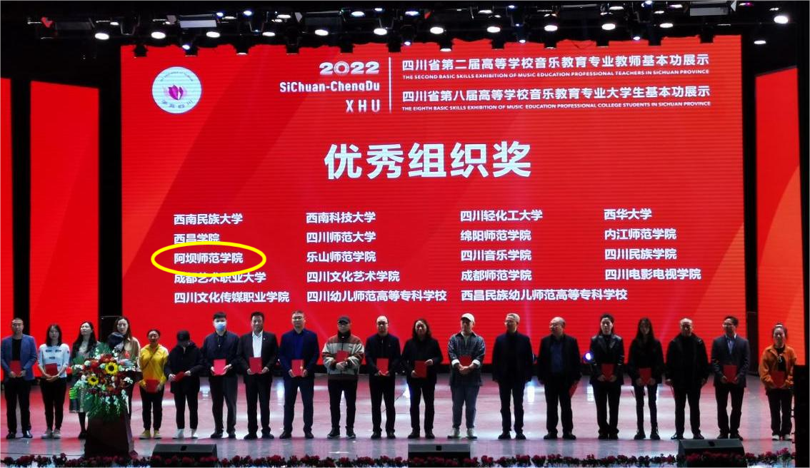 【本网讯】2022年10月24日—28日,由四川省教育厅主办,西华大学承办、四川省教育科学研究院协办的四川省第二届高等学校音乐教育专业教师基本功展示暨四川省第八届高等学校音乐教育专业大学生基本功展示在西华大学音乐与舞蹈学院隆重举行,阿坝师范学院音乐舞蹈学院师生通过为期3个月的紧张集训,在此次基本功展示活动中再创佳绩。学校获教育厅颁发优秀组织奖、团体二等奖,参展师生获个人全能奖6项、单项奖18项。