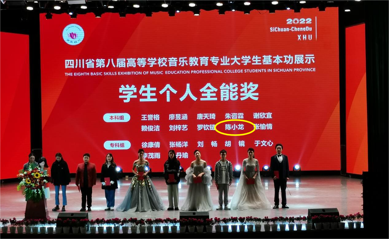 1、陈小龙:个人全能一等奖;自弹自唱单项奖(第10名);合唱指挥单项奖(第5名);微课单项奖(第6名);