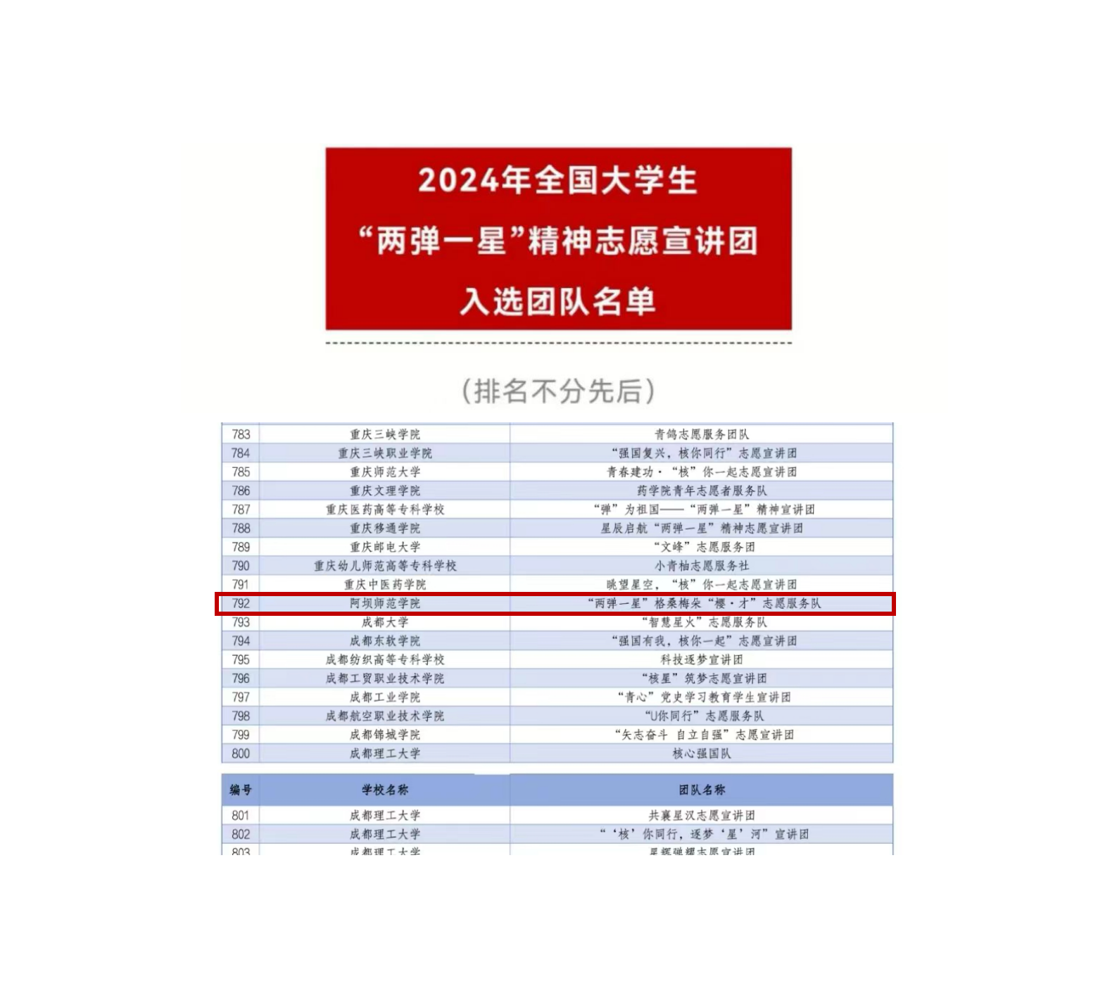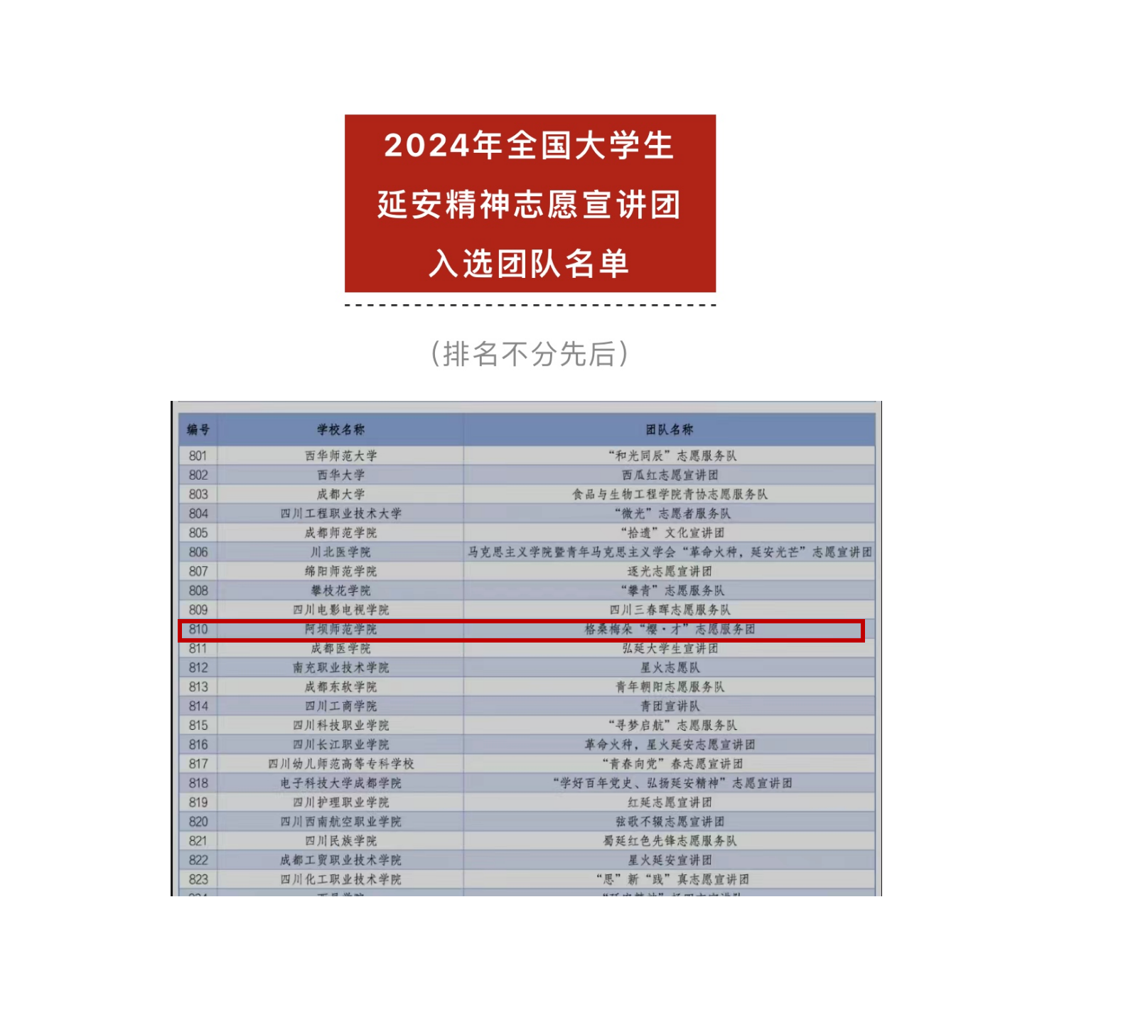 【本网讯】为深入学习宣传贯彻习近平新时代中国特色社会主义思想和党的二十大精神,引导动员青年学生弘扬延安精神、“两弹一星”精神。团中央青年志愿者行动指导中心、国家电力投资集团有限公司、共青团陕西省委、中共延安市委联合开展2024年全国大学生“延安精神”志愿宣讲活动;团中央青年志愿者行动指导中心、中国核工业集团有限公司联合开展 2024 年全国大学生“两弹一星”精神志愿宣讲活动。我校格桑梅朵“樱·才”志愿服务团(队)成功入选2024年全国大学生延安精神志愿宣讲团和“两弹一星”精神志愿宣讲团。