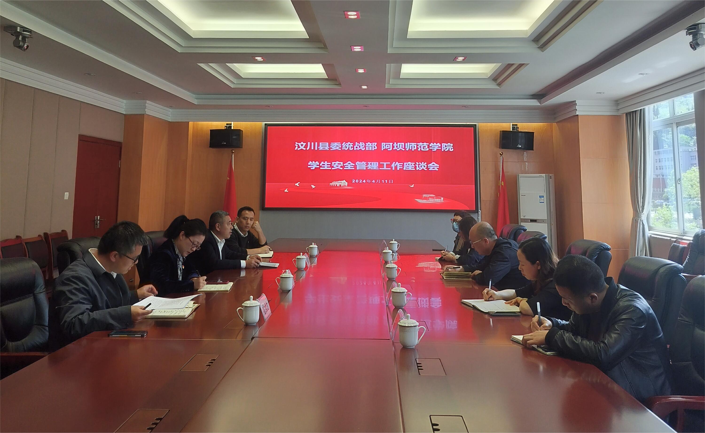 【本网讯】4月11日,汶川县委统战部副部长姚永桥一行3人,在水磨镇赵琼英、张祺同志的陪同下到我校开展学生安全管理座谈,重点围绕民族宗教工作交流研讨。我校党委宣传统战部、学生工作部、保卫处、藏汉双语学院参加座谈会并作工作汇报,座谈会由宣传统战部副部长卜凡主持。
