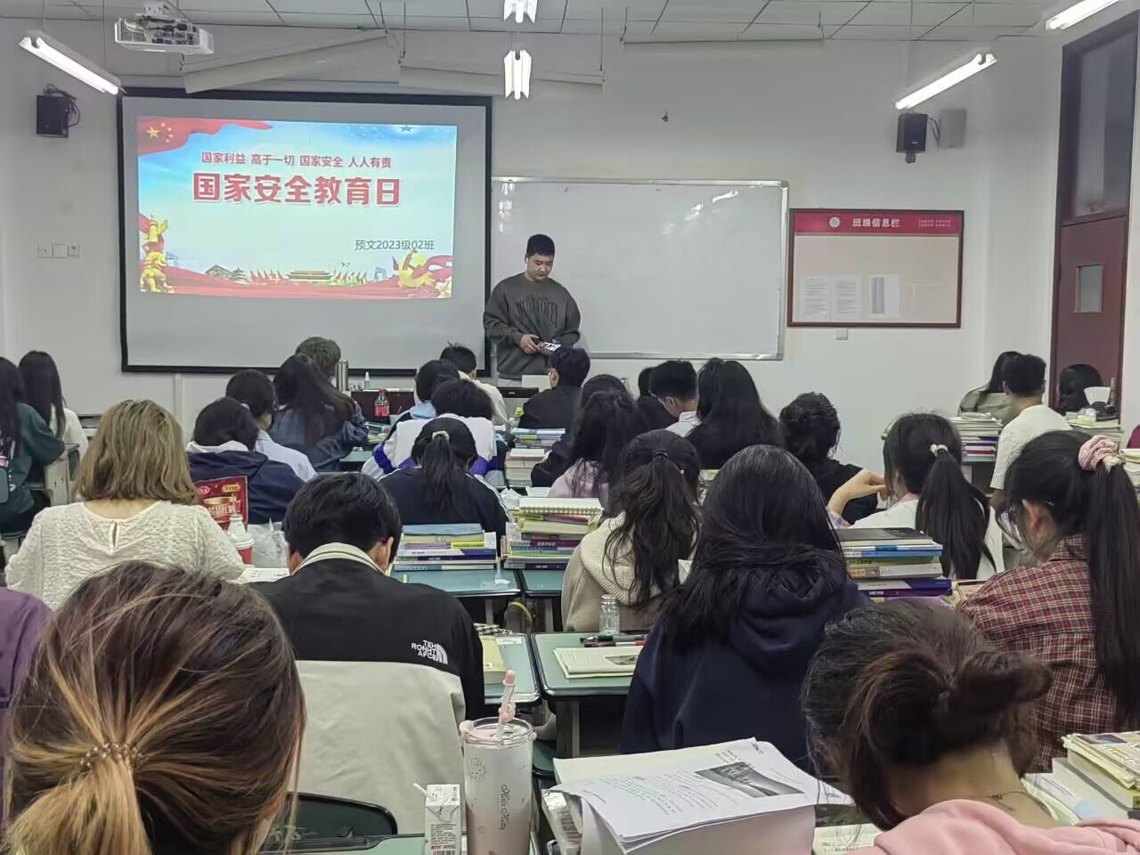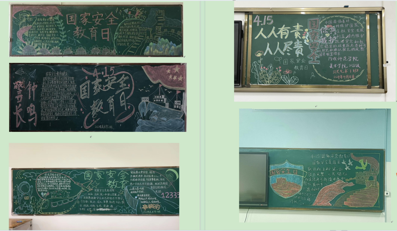美术学院充分利用大厅电子显示屏投放精心设计的国家安全宣传海报,积极组织各班班长及宣传委员利用周末每个教室画黑板报,以图文并茂的形式,生动展现国家安全的重要性。