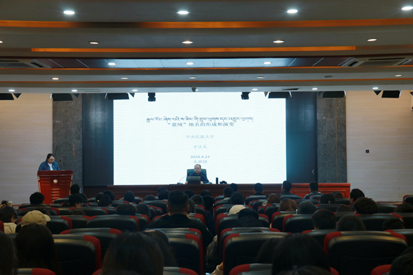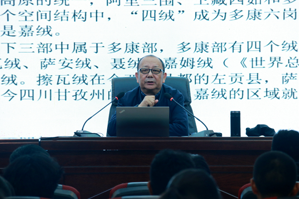 【本网讯】为铸牢中华民族共同体意识,助推民族团结之花常开长盛。2024年4月23日19:00,中央民族大学藏学研究院原院长、中国少数民族语言文学学院教授、博士生导师才让太应邀到我校学术报告厅作《“嘉绒”地名的形成和演变》的学术讲座。党委常委、副校长尕让他及藏汉双语学院师生代表出席讲座,讲座由藏汉双语学院教师拉毛才让主持。