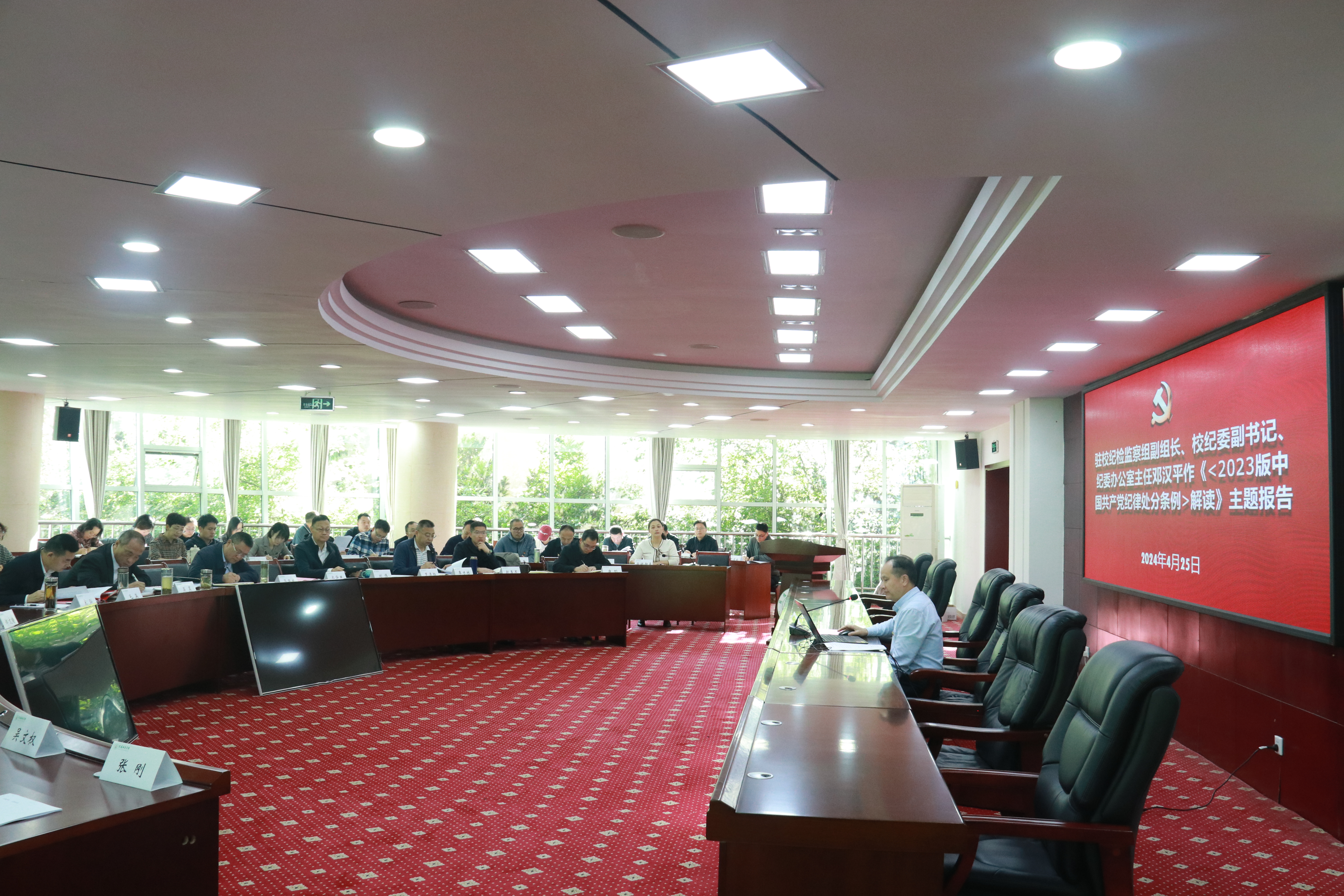 驻校纪检监察组副组长、校纪委副书记、纪委办公室主任邓汉平作《<2023版中国共产党纪律处分条例>解读》主题报告。他围绕修订《条例》的重要意义、修订的主要内容、《条例》的贯彻执行三方面作深刻解读。他指出,《条例》是促进全党深刻领悟“两个确立”的决定性意义、坚决做到“两个维护”的具体要求;是贯彻落实习近平新时代中国特色社会主义思想的具体行动;是坚持问题导向、用严明纪律管全党治全党的现实需要;是总结从严管党治党经验、实现制度与时俱进的实践要求。他强调,各单位要担负起全面从严治党政治责任,要深刻领悟习近平总书记关于党的自我革命的重要思想,关于健全全面从严治党体系、全面加强党的纪律建设重要论述,更加深刻领悟“两个确立”的决定性意义,更加坚决做到“两个维护”,切实把自己摆进去、把工作摆进去、把职责摆进去,深入领会《条例》的重点内容和着力方向,强化自我约束,提高免疫能力,凝聚干事创业的精气神,在新征程上为学校发展作出新的更大的贡献。