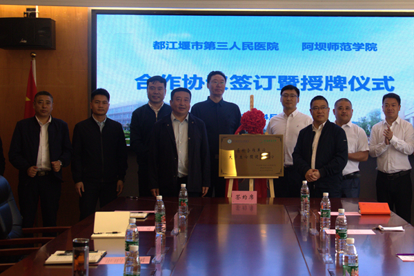 【本网讯】4月28日10:30,我校与都江堰市第三人民医院在行政楼406会议室隆重举行合作签约暨揭牌仪式,都江堰市第三人民医院党支部书记李舜、院长王壮、工会主席杨小刘等相关人员,我校党委常委、副校长尕让他,对外合作处处长罗清杨,党委学生工作部部长钟顺秋,校团委书记李家发,保卫处副处长余宗贤,心理健康教育与咨询中心负责人欧阳逸、教师何兰兰出席本次仪式。仪式由钟顺秋主持。