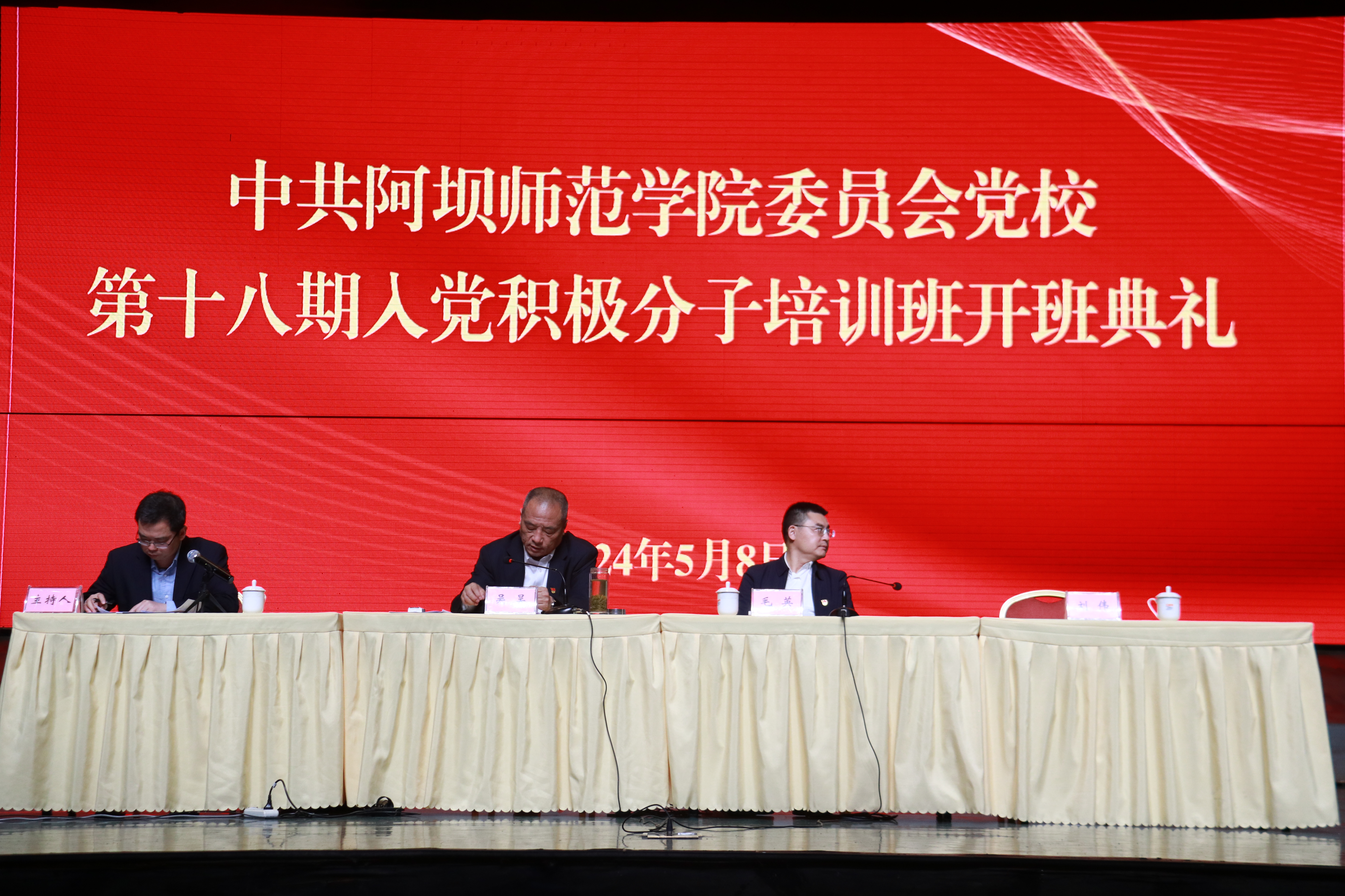 【本网讯】2024年5月8日下午,中共阿坝师范学院委员会党校第十八期入党积极分子、第六期发展对象和预备党员培训班开班典礼在水墨桃源大剧院举行。党委书记吴昊、党委副书记毛英、各二级学院党委(党总支)书记、全体专职组织员,宣传统战部、学生工作部、校团委主要负责人,党校兼职教师及相关人员出席此次开班典礼,培训班全体学员参加本次开班典礼。本次典礼由机关党委书记、党建办主任、组织部副部长唐刚主持。