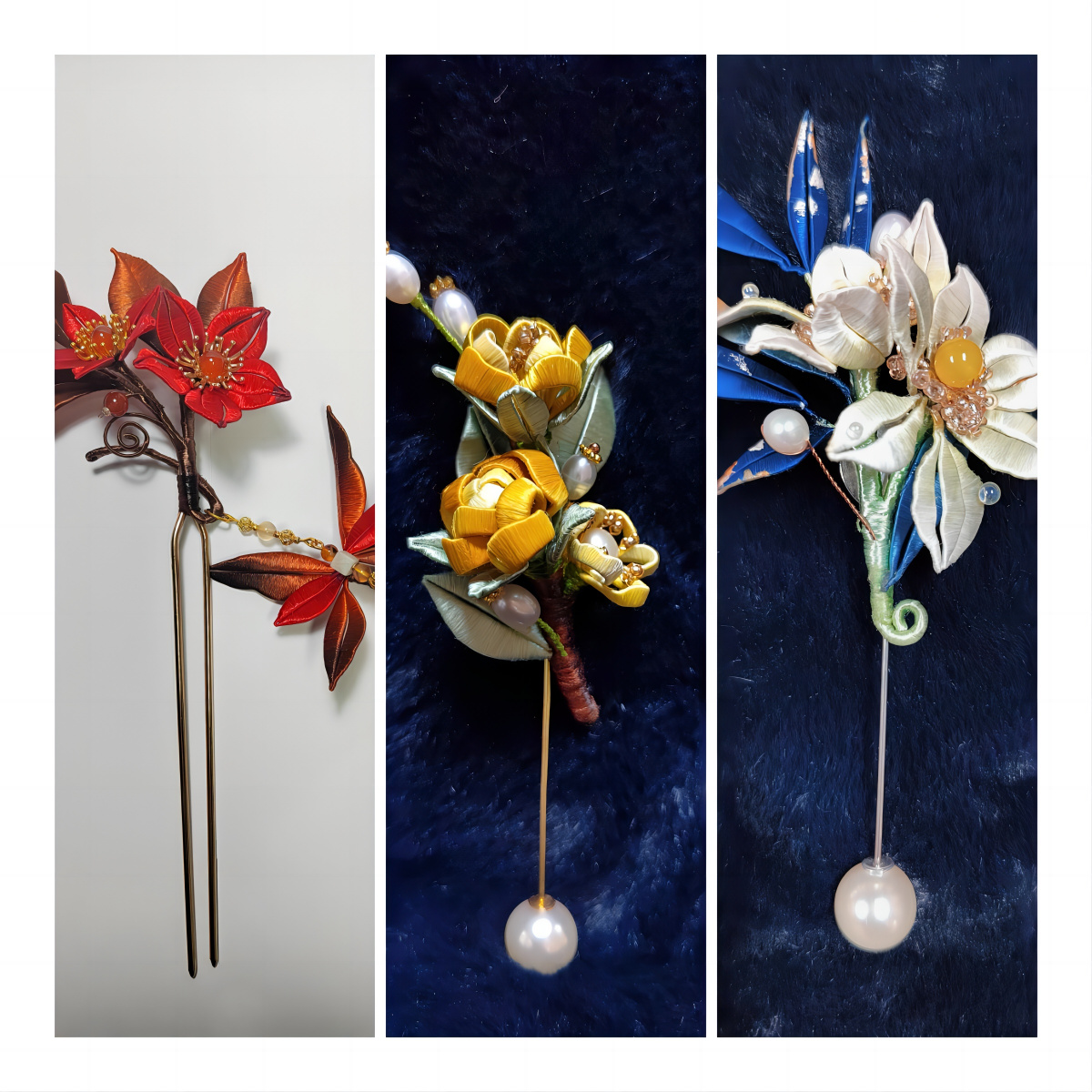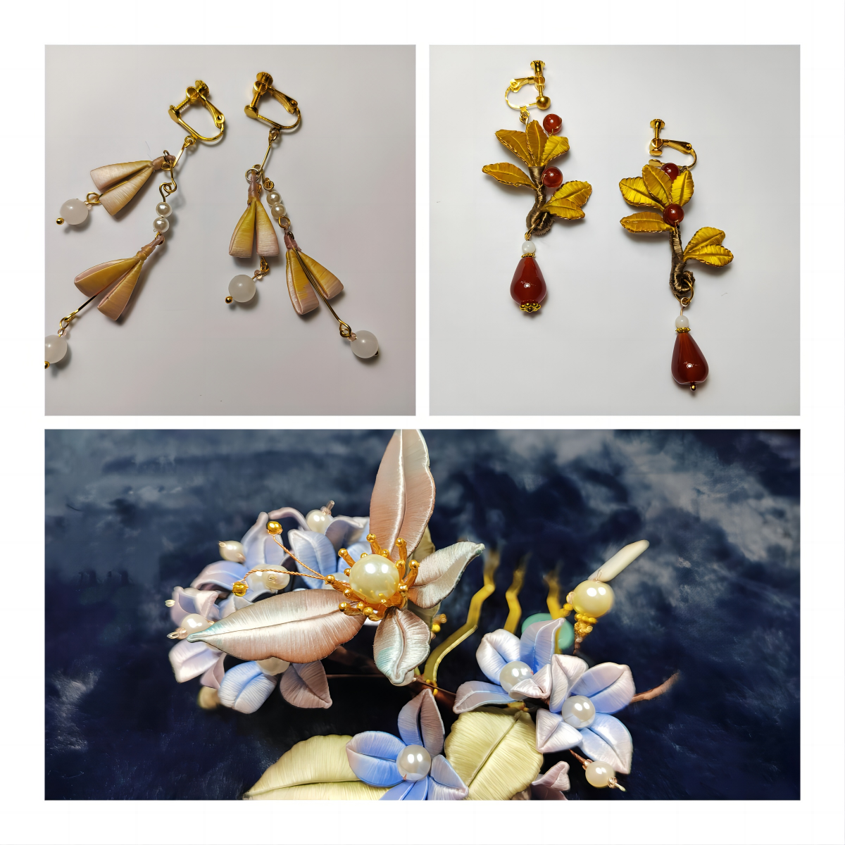饰品系列由耳坠、胸花、发簪三类女性喜爱的饰品组成,作品取材于生活常见花卉的含蓄、绽放等自然姿态,造型遵循花卉生长的规律,凸显现代女性端庄典雅气质,对女士发鬓及衣物装饰等有添彩点睛之功,深受女性青睐。