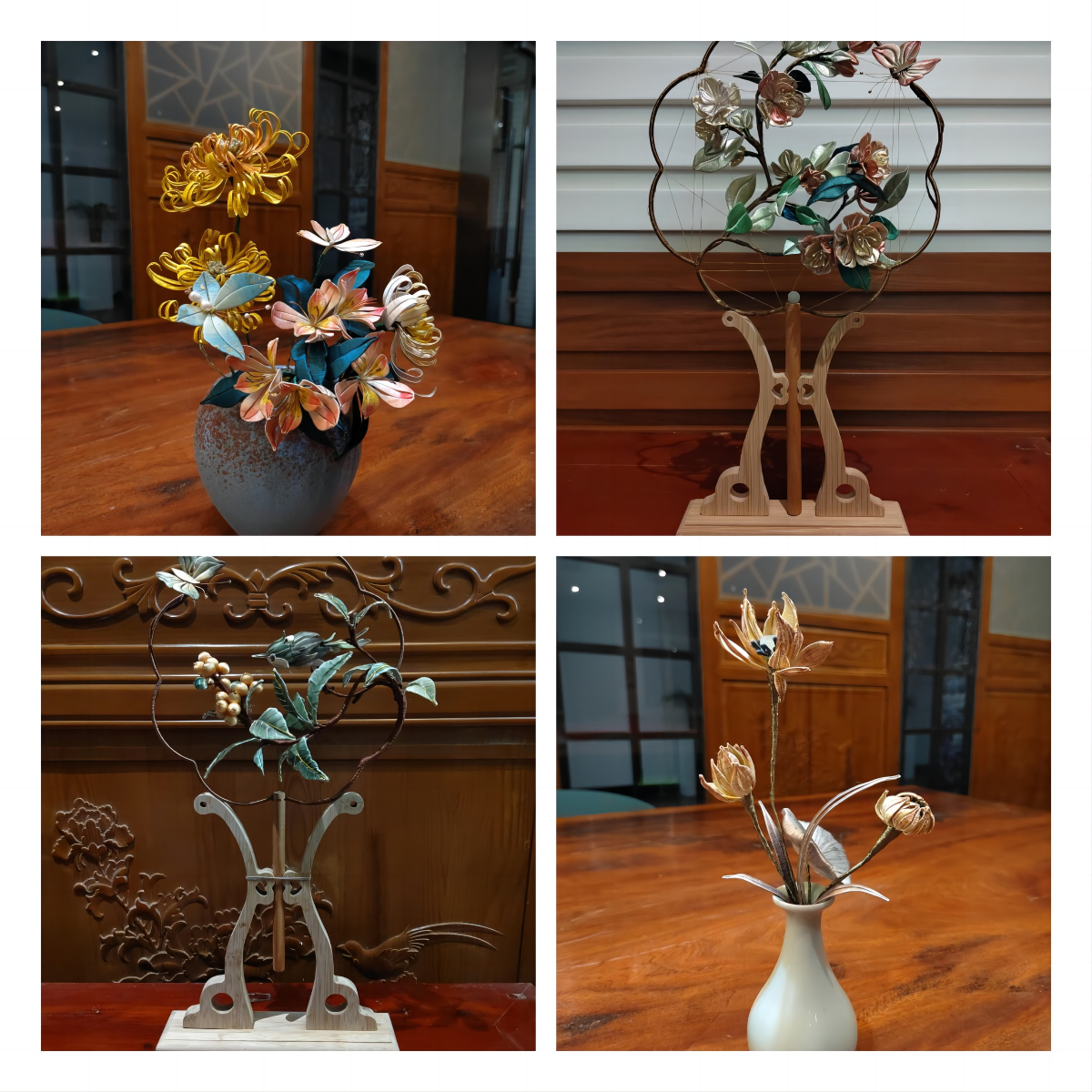 摆设系列由《杷叶金果扇》《金银花蝴扇》《小荷伴青草》《蝶恋菊花绽》等4件作品组成,造型取材生活中常见的自然动植物,将现代家具摆设与传统手工艺相结合,以绽放的花卉与蝶花的场景,寓意良好的生态环境是美好生活的前提,想生活舒适就要爱护自然。