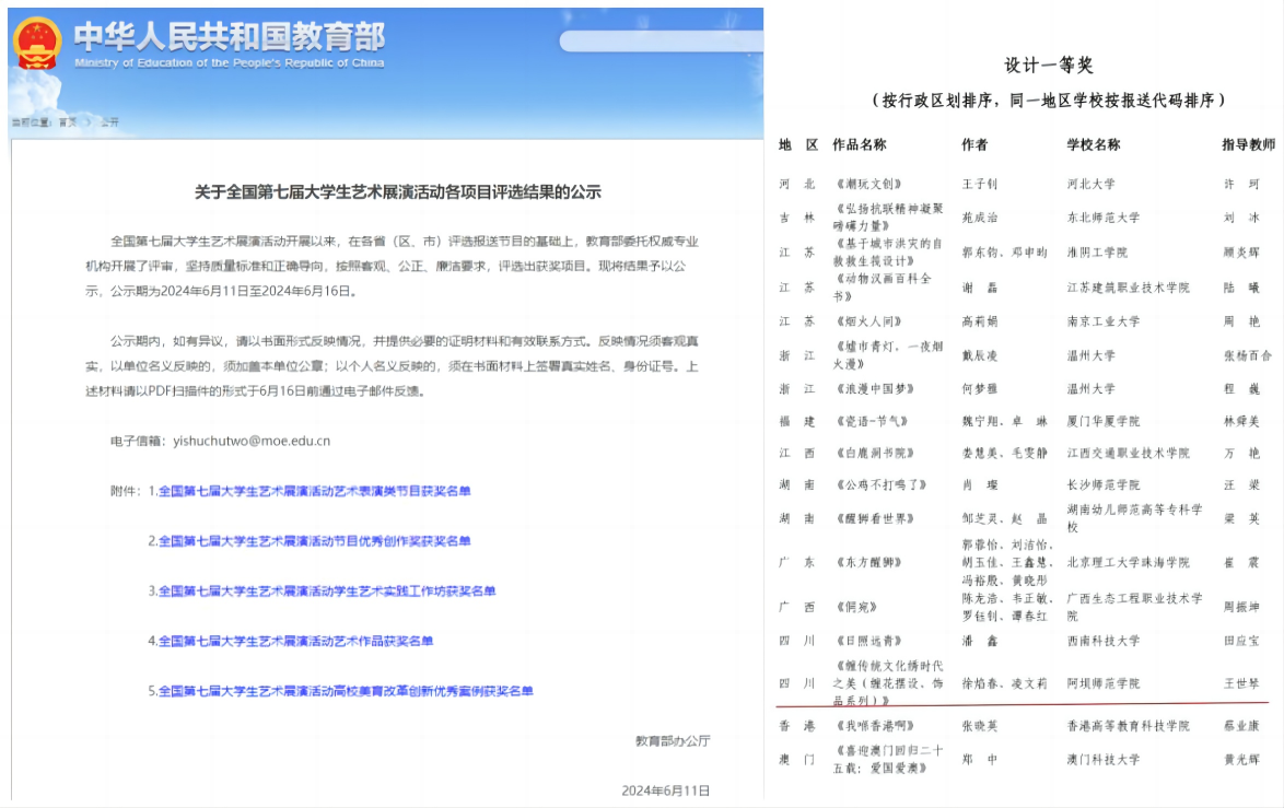 【本网讯】近日,由教育部和湖北省人民政府主办的“厚植家国情怀 涵养进取品格”为主题的全国第七届大学生艺术展演活动在湖北襄阳拉开帷幕。本届大学生艺术展演活动项目包括艺术表演、艺术作品、学生艺术实践工作坊、高校美育改革创新优秀案例四类,共282个项目,7400余名师生参加,是教育系统举办的规模最大、规格最高、影响最广的艺术实践活动。根据教育部办公厅发布的《关于全国第七届大学生艺术展演活动各项评选结果的公示》显示,我校作品《缠传统文化 绣时代之美》(缠花摆设、饰品系列)荣获全国第七届大学生艺术节设计类专业组一等奖,创下我校该类别比赛历史最好成绩。