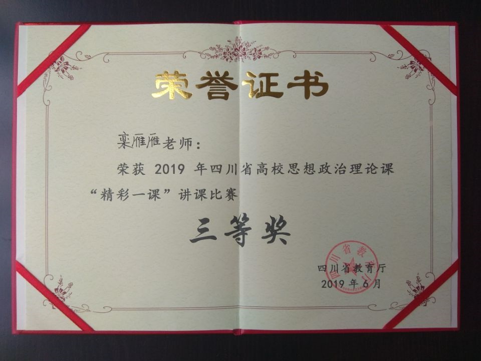 【本网讯】6月24-25日,我校马克思主义学院栾雁雁老师参加了由四川省教育厅主办,西南科技大学承办,四川教育报刊社、四川省教育基金会、四川省高校思政课教学研究会协办的四川省高校思想政治理论课“精彩一课”讲课比赛决赛,并获“思想道德修养与法律基础”本科组三等奖。