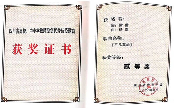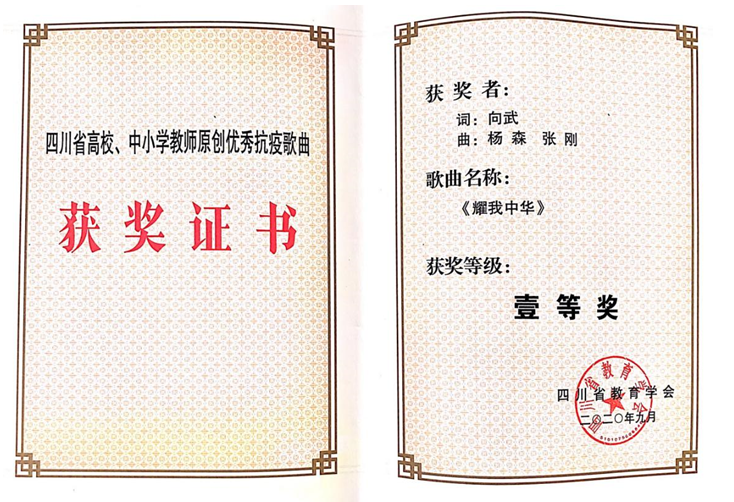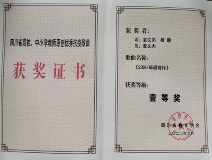近期,四川省教育学会组织专家,对选送的优秀歌曲进行了客观、公平、公正的评审,我校原创歌曲《2020砥砺前行》《耀我中华》获得一等奖 ,原创歌曲《平凡英雄》获得二等奖的殊荣。