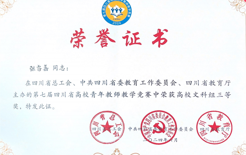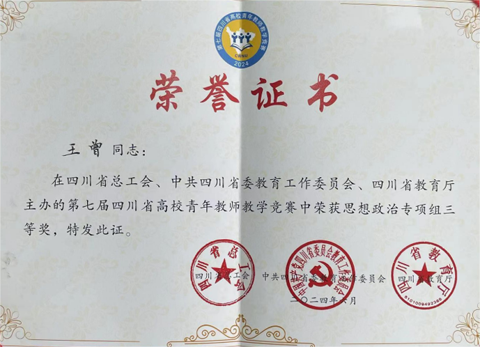 【本网讯】6月28日,四川省第七届高校青年教师教学竞赛决赛在西华师范大学正式落下帷幕。我校经济与管理学院张睿嘉和马克思主义学院王曾,两位青年教师凭借精湛的讲课技艺、严谨的教学设计和精彩的现场表现,分别获得省文科组三等奖,省思政专项组三等奖,学校获得优秀组织奖。学校取得了近年来在该项赛事上的最好成绩。