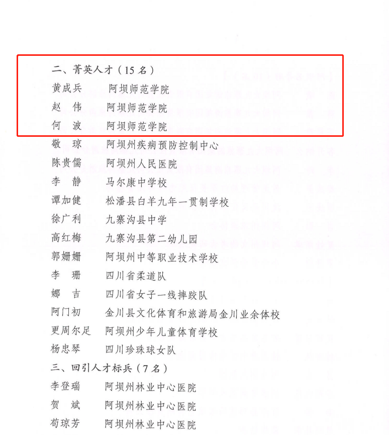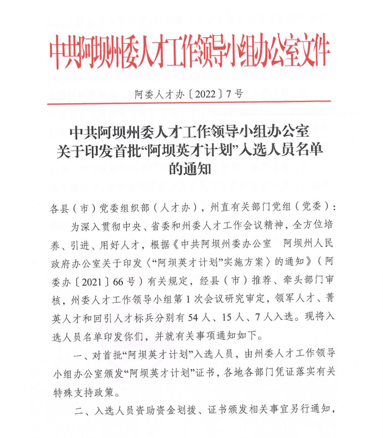 【本网讯】为深入贯彻中央、省委和州委人才工作会议精神,全方位培养、引进、用好人才,根据《中共阿坝州委办公室、阿坝州人民政府办公室关于印发<“阿坝英才计划”实施方案>的通知》有关规定,各地、各部门根据各项目申报通知要求,按属地管理和行业归口推荐的原则,分头开展推荐申报遴选工作,经推荐、牵头部门审核,州委人才工作领导小组第一次会议研究审定以及公示,领军人才、菁英人才和回引人才标兵共有76人入选。