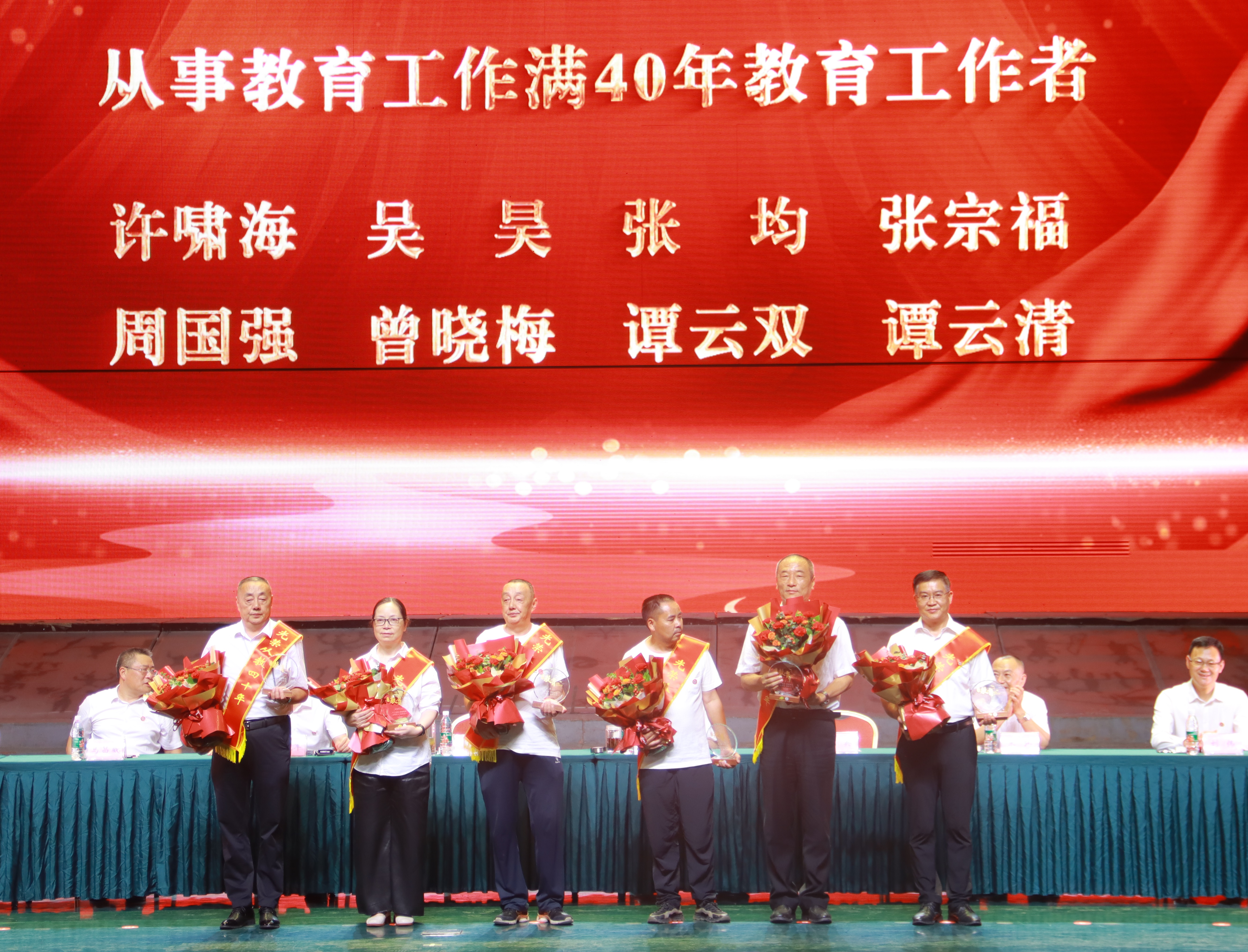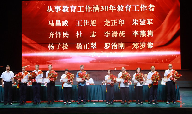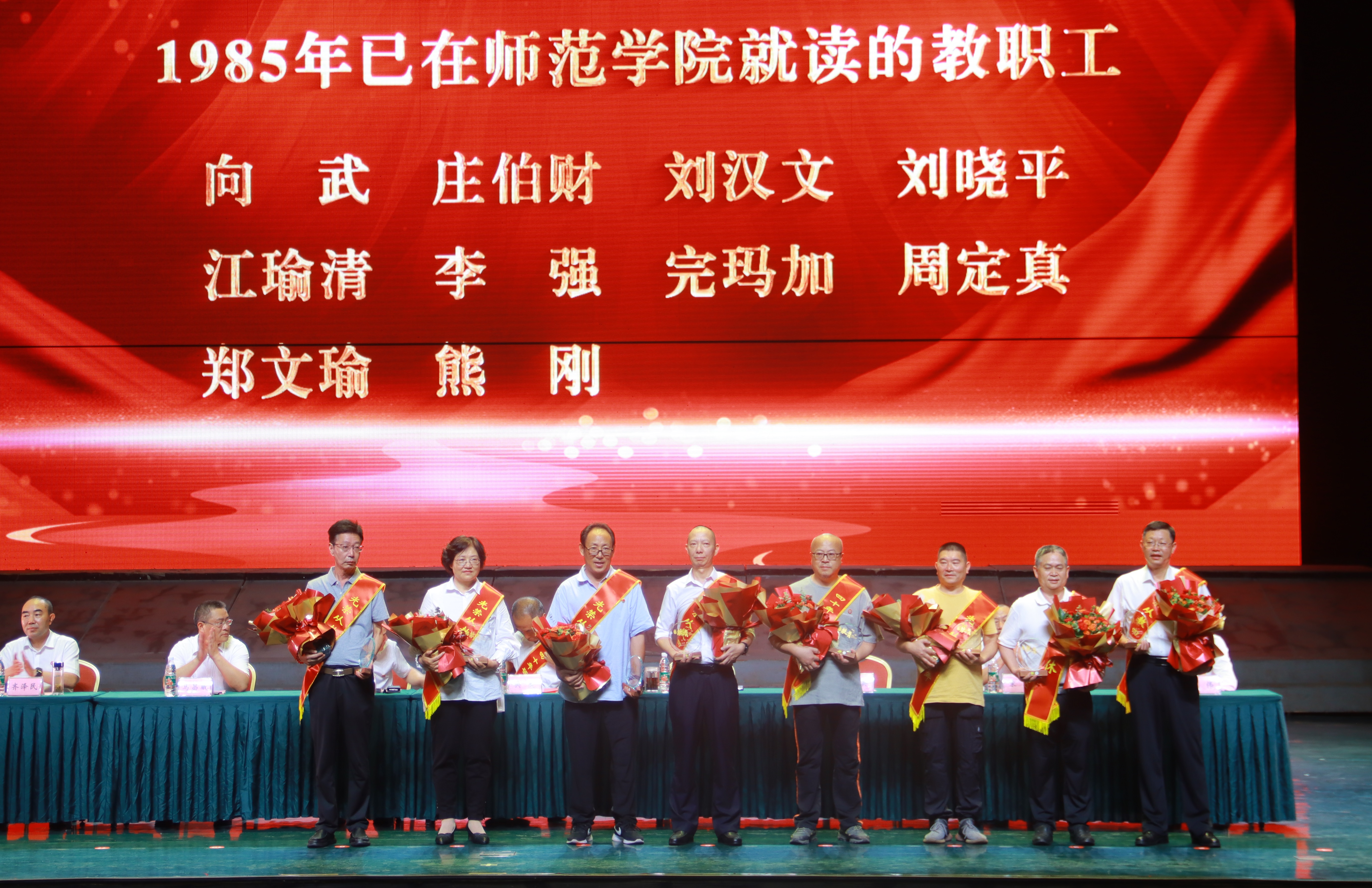 与会校领导分别为从事教育工作工龄满30年的教育工作者颁发荣誉证书,为1985年已在师范学院就读的教职工颁发纪念品,为从事教育工作40年的教职工颁发纪念品,为荣休教师颁发荣休证书。