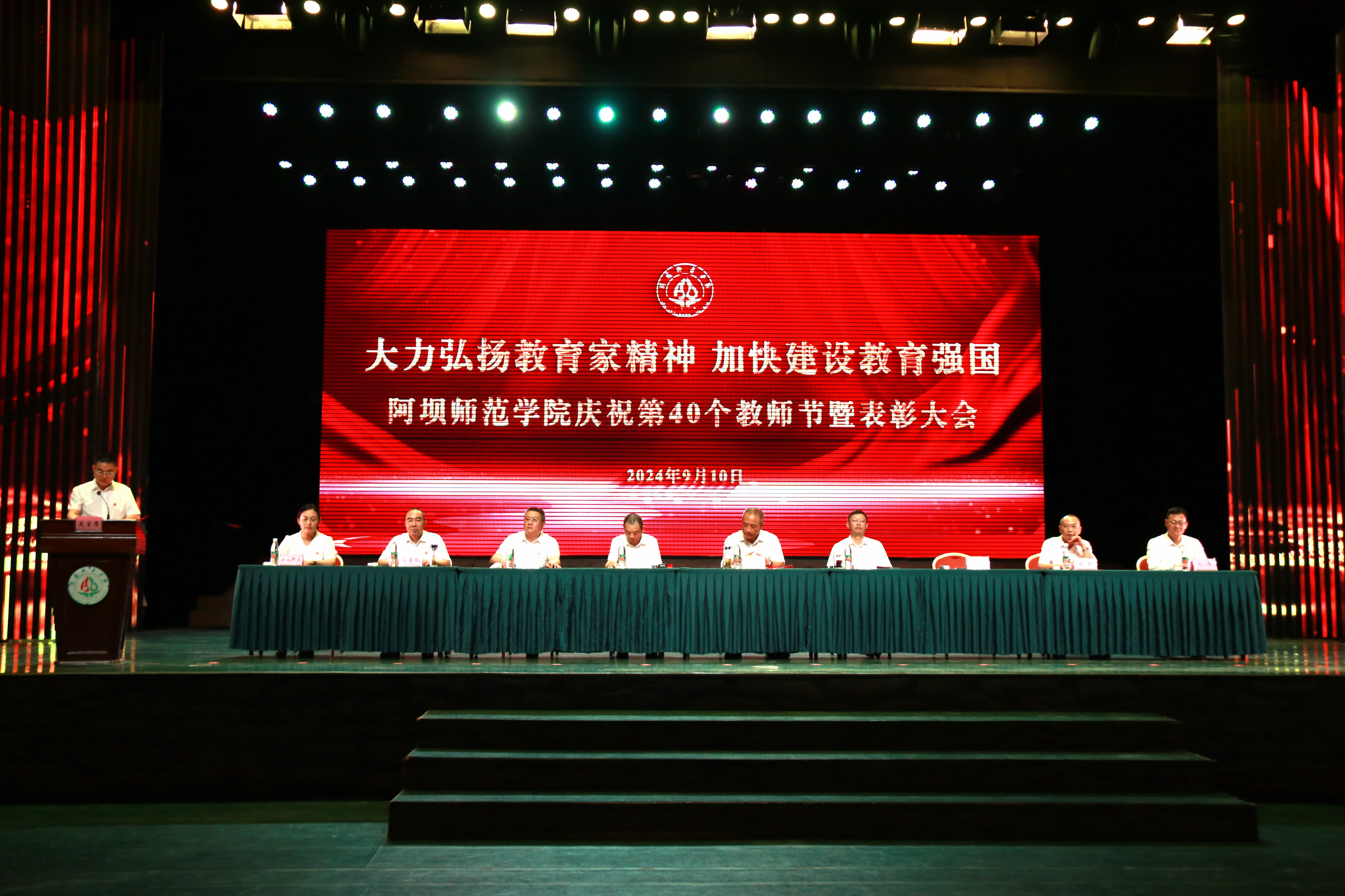 【本网讯】藏羌福地育桃李,寿溪河畔点春秋。2024年9月10下午14:30,为弘扬新时代教育家精神,树立教育典范,激励广大教育从业者的积极性和创造性,推动教育事业高质量发展,我校在水墨桃源大剧院举行庆祝第40个教师节暨表彰大会。我校党委书记吴昊,党委副书记、校长向武,四川省纪委监委驻阿坝师范学院纪检监察组组长、党委副书记、纪委书记朱建军,党委副书记毛英,党委常委、副校长马昌威,党委常委、副校长、工会主席宋弘,党委常委、副校长齐泽民,党委常委、组织部部长刘伟,党委常委、宣传统战部部长查旺斯基出席会议。本次表彰大会由毛英主持会议。