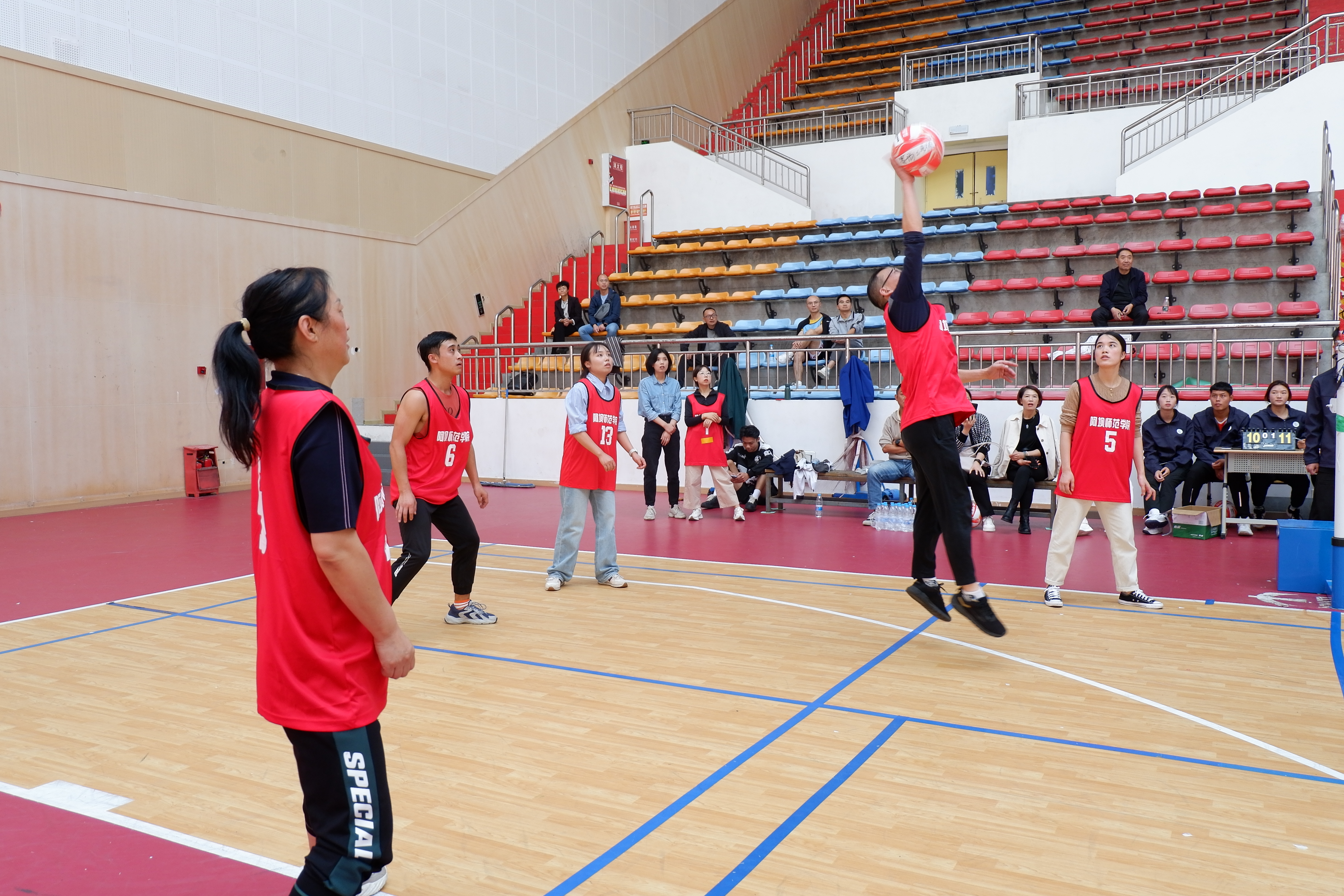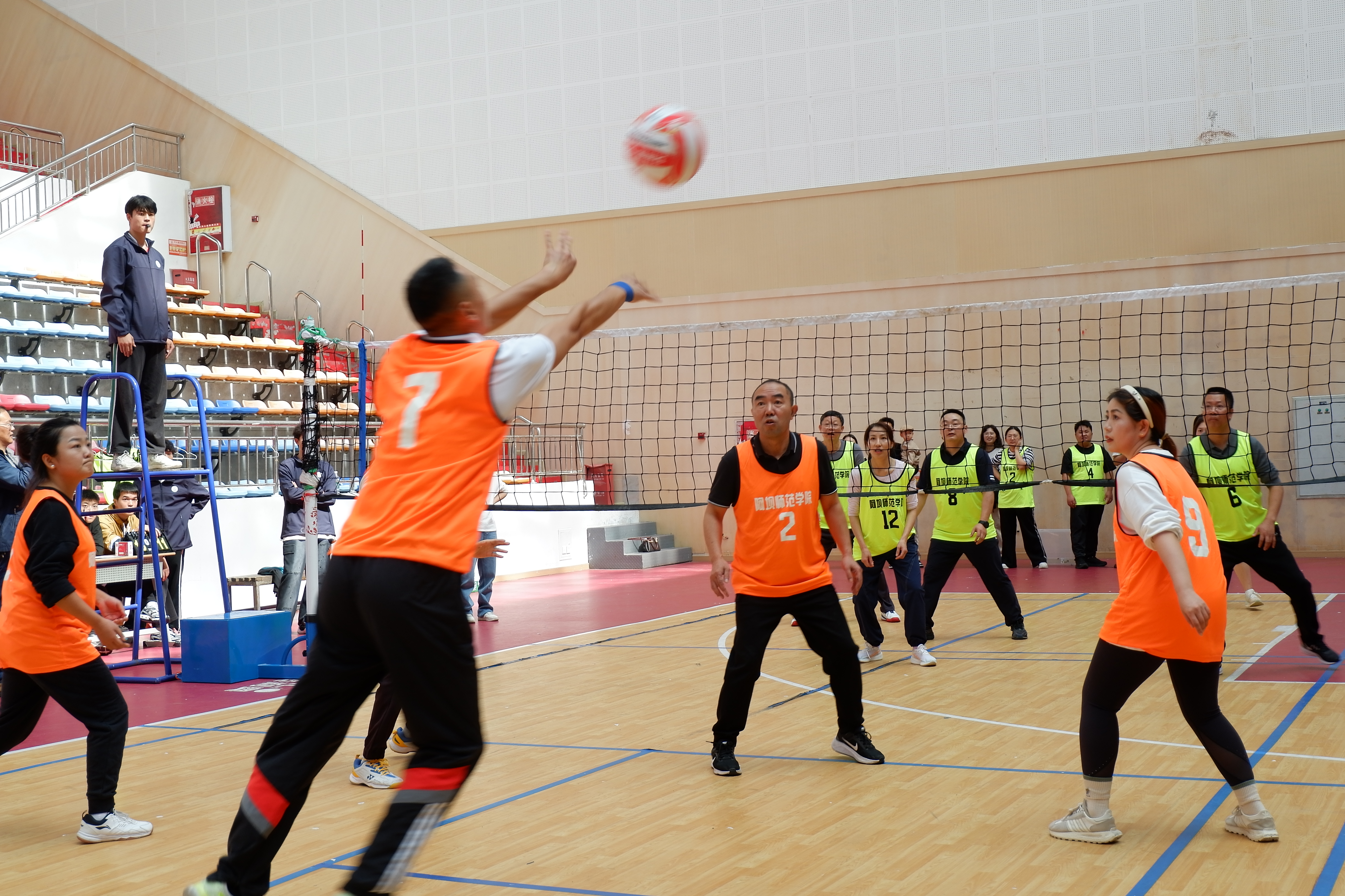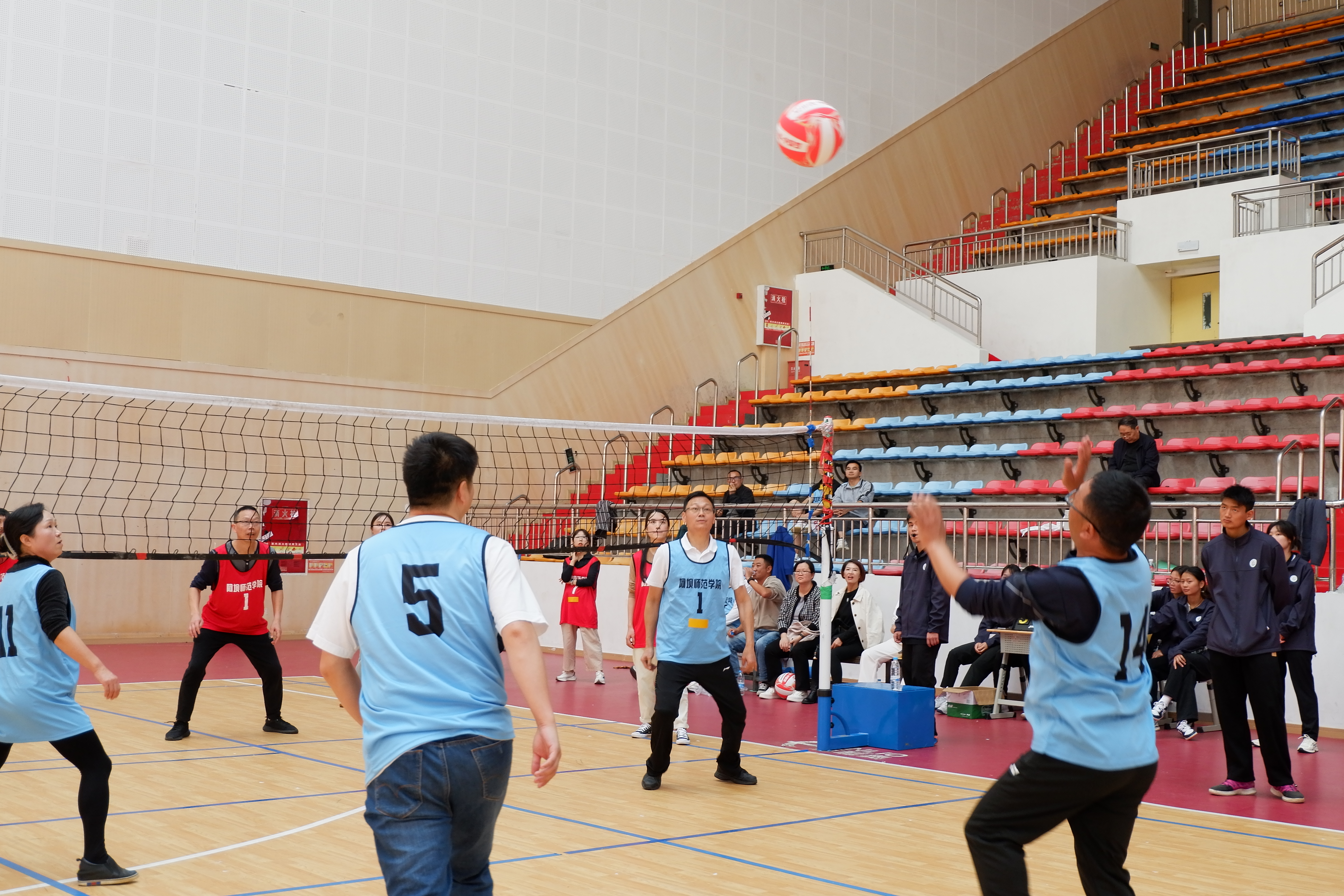 赛场上,选手们精神饱满,斗志昂扬,每球必争,打出许多精彩的回合球。赛场旁,啦啦队的呐喊加油声也是此起彼伏,激情四射。裁判员们一丝不苟,在保证比赛趣味性的同时,也为比赛的顺利公正地进行保驾护航,这都集中展现了阿师人团结奋进、拼搏向上的精神风貌。