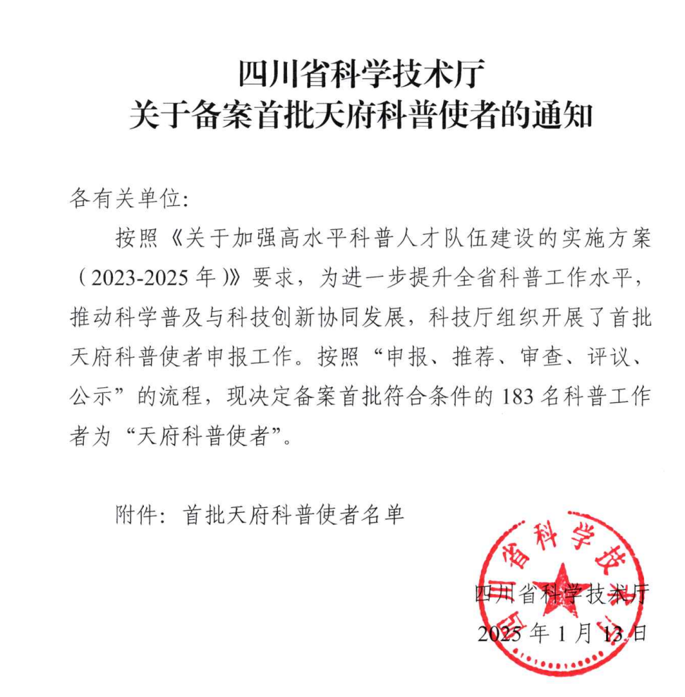 据了解,首批天府科普使者备案工作由四川省科技厅精心组织开展,经过申报、推荐、严格审查、专业评议、公示等一系列严谨程序,全省183名优秀科普工作者获得备案。