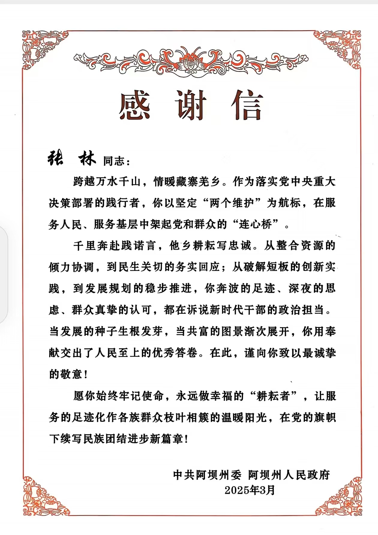 (图:阿坝州委、州政府给张林教授撰写的感谢信)